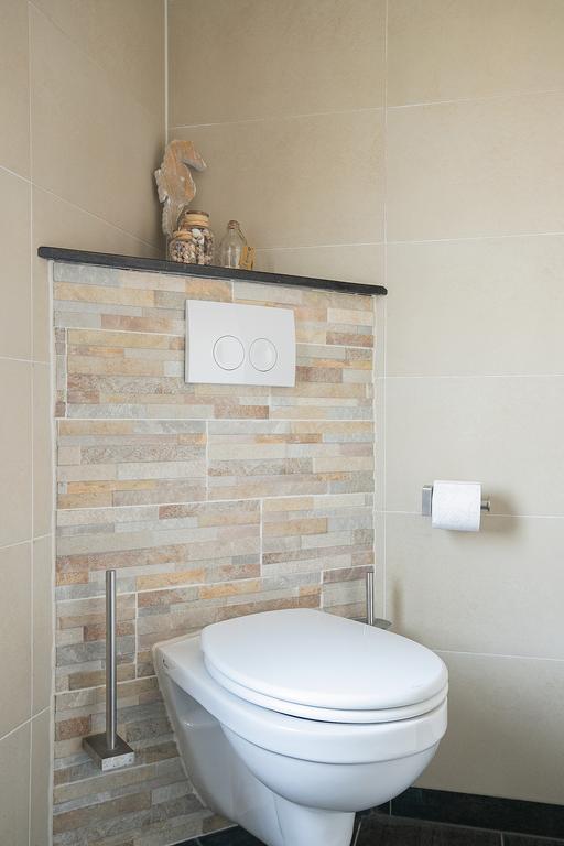 Betegelde toiletruimte met een design radiator en het zwevend closet met muurspoeling.