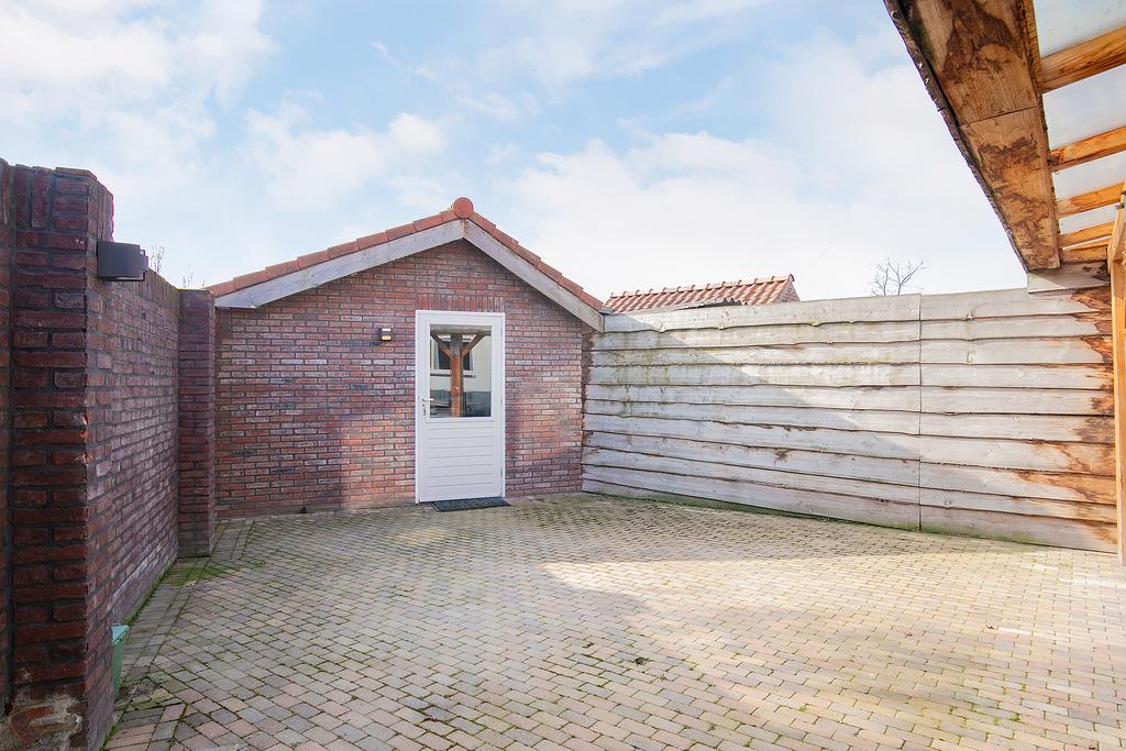 Privacy biedende achtertuin op zonzijde gelegen met een gemetselde deels houten delen erfafscheiding, buitenkraantje, sfeervolle terrasoverkapping en aangelegd met sierbestrating.