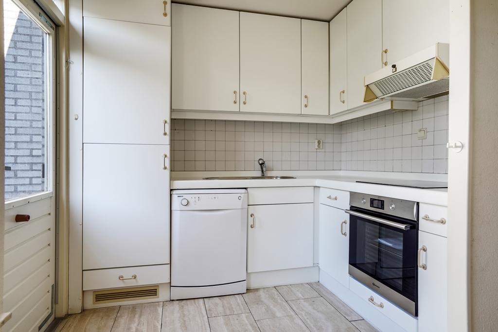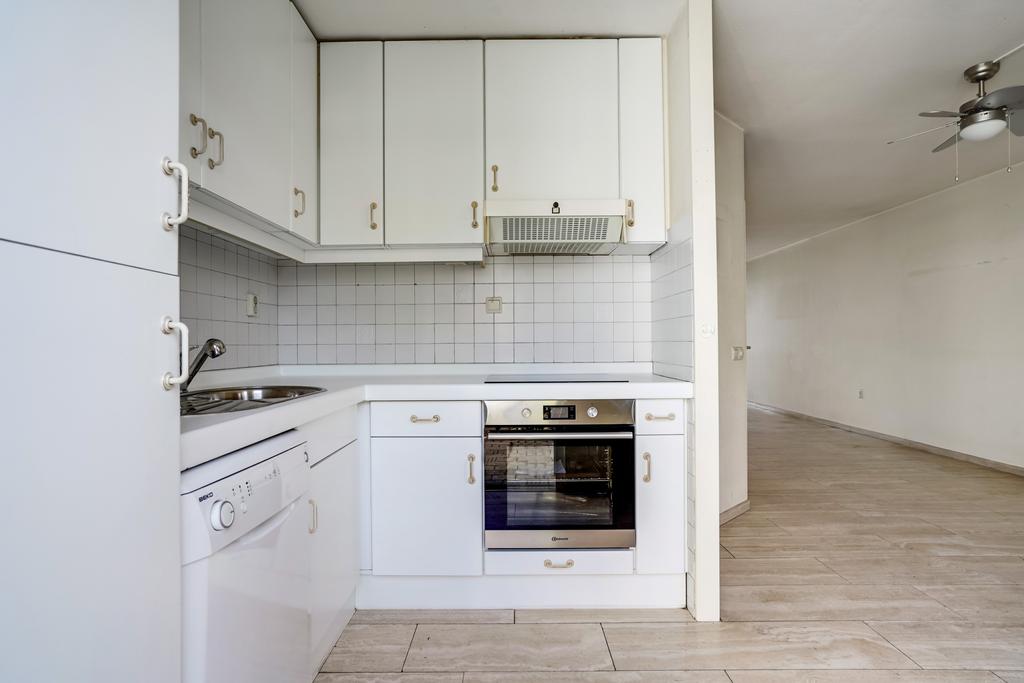 Open keuken met een praktische keukeninrichting in hoekopstelling voorzien van diverse laden en kasten, koelkast, vaatwasmachine, elektrische oven, inductie kookplaat, afzuigkap en rvs spoelbak.
