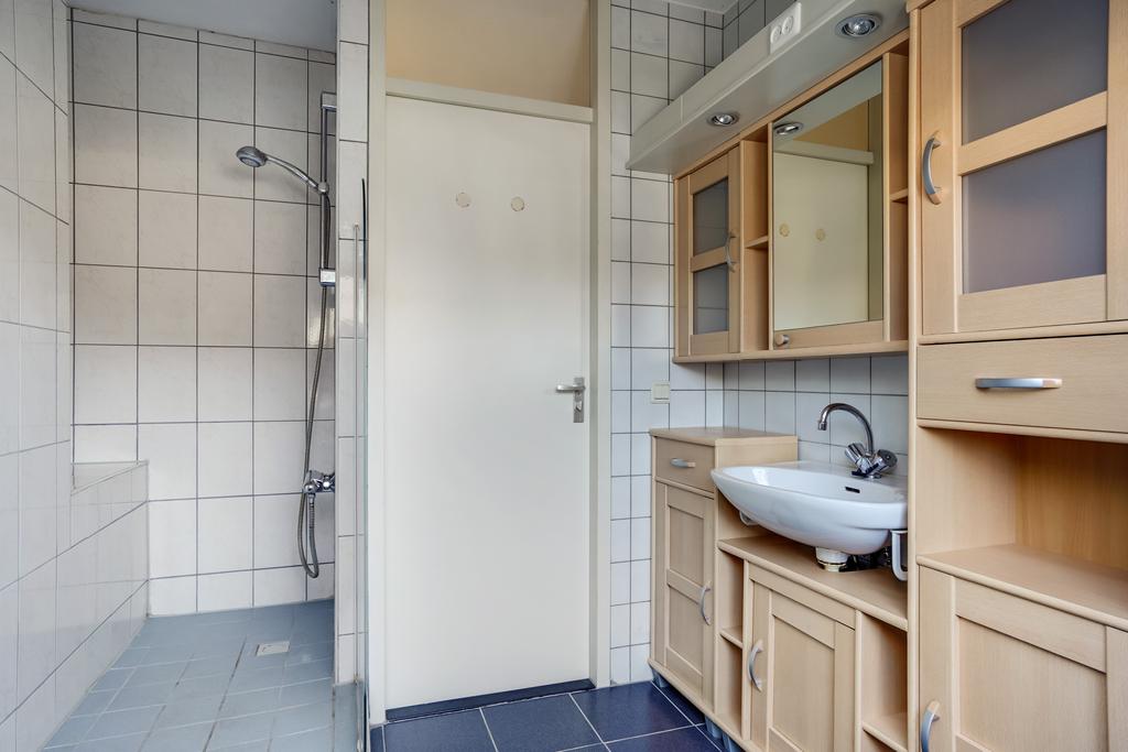 Betegelde badkamer voorzien van een inloopdouche, wastafel en closet.
