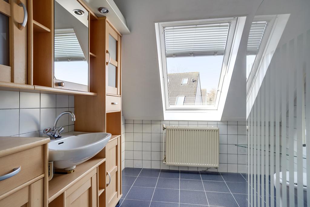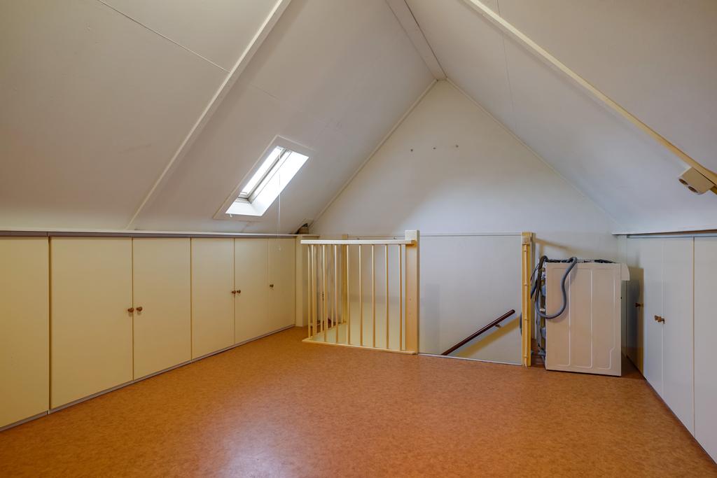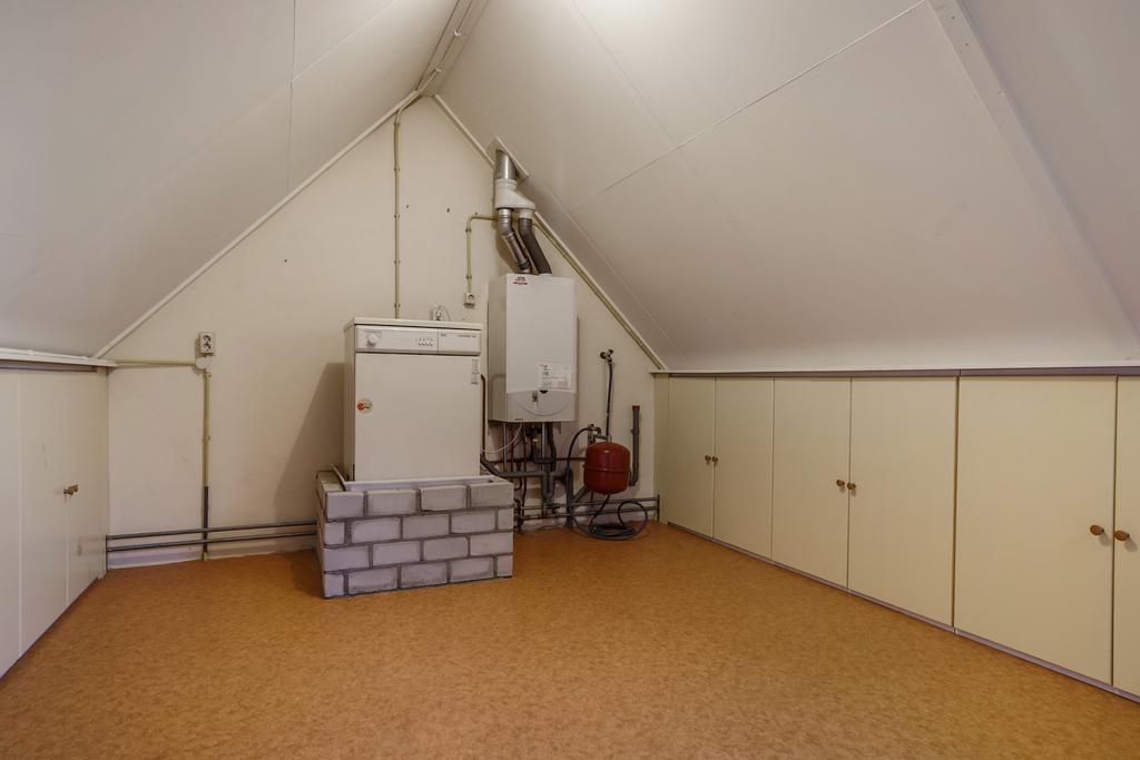 Zolderetage met bergkasten onder de schuinte van de kap, Velux dakvenster, aansluiting t.b.v. wasapparatuur en opstelling van de HR combiketel van Bosch (2005).