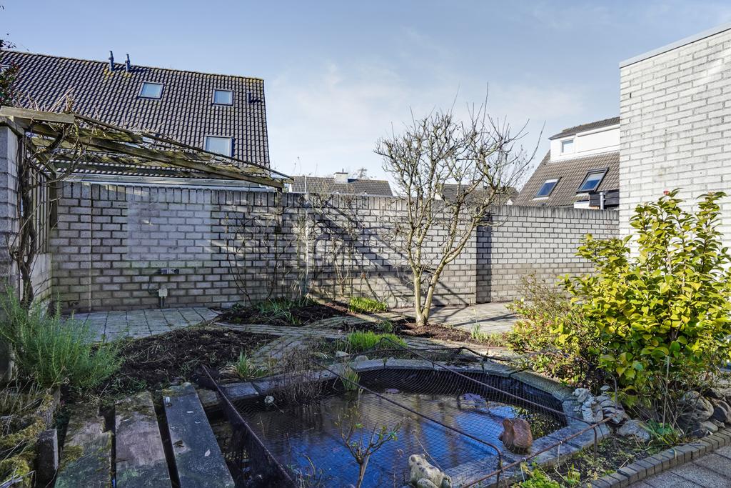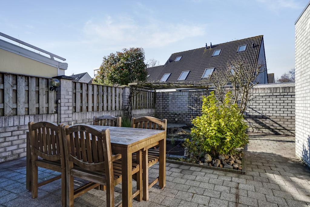 Achtertuin (8.39 x 10.00 meter) aangelegd met sierbestrating, beplanting en een gemetselde deels houten delen erfafscheiding.