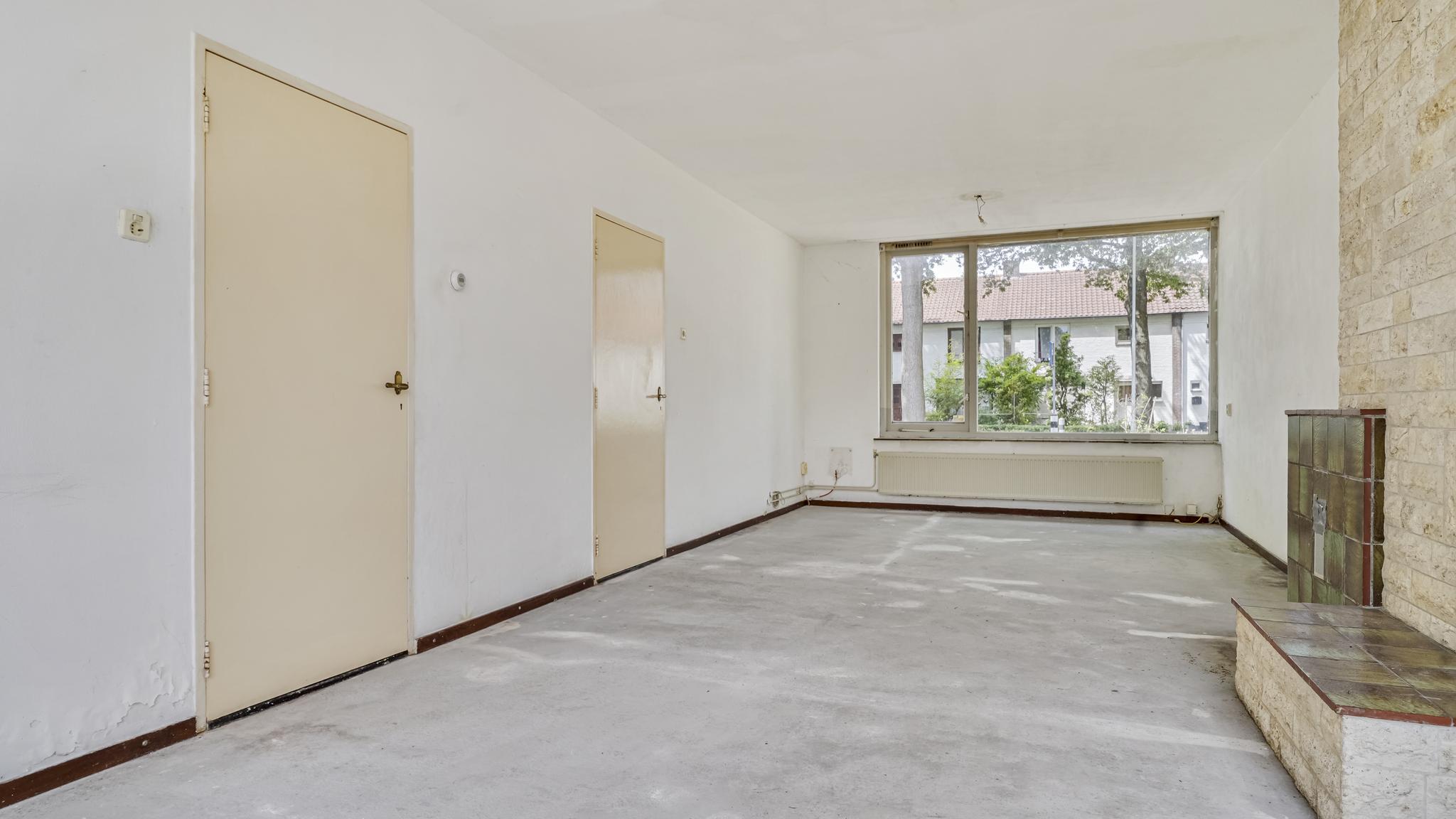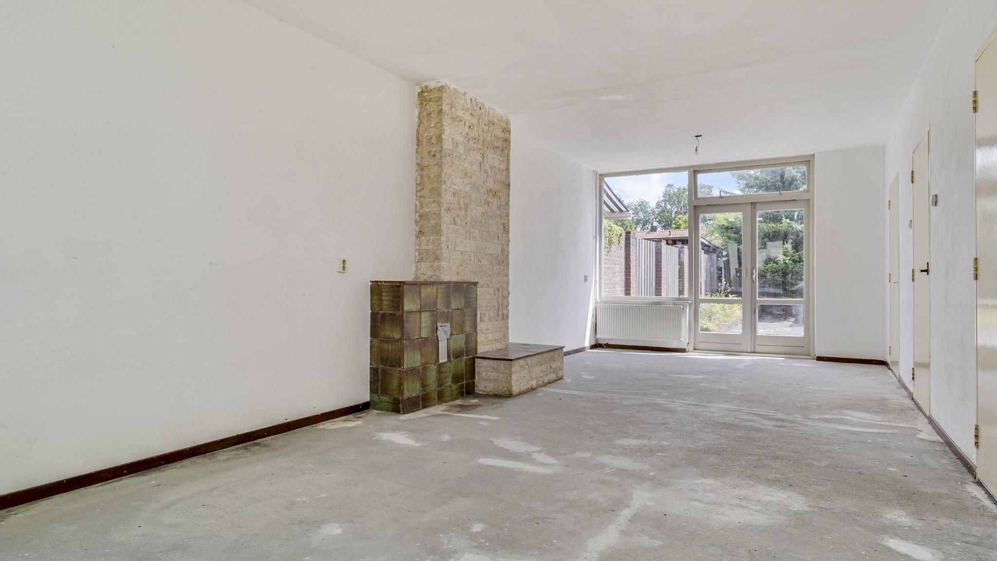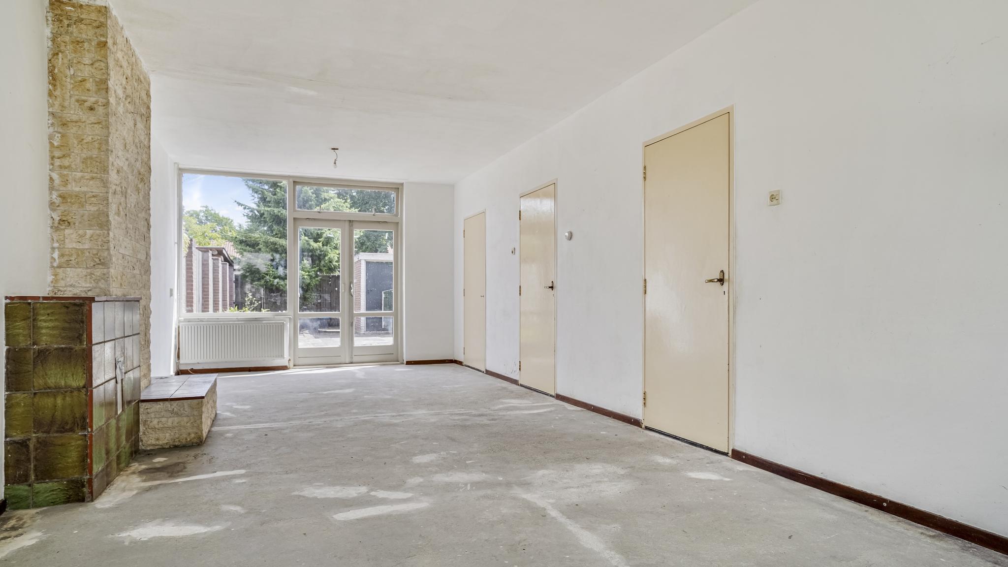 Ruime doorzon living met openslaande tuindeuren en afgewerkt met een betonvloer, stucwerk wanden en een structuur plafond.