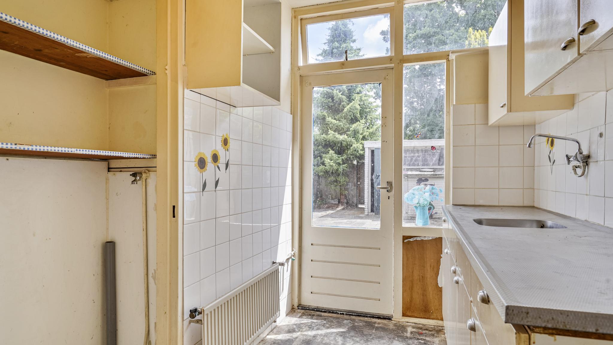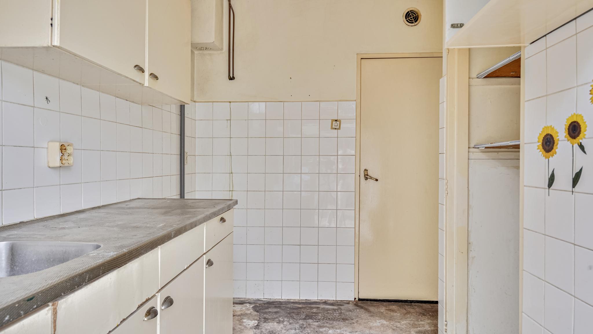 De afzonderlijke keuken is afgewerkt met tegelwerk- deels pleisterwerk wanden en -plafond. Eenvoudige houten keukeninrichting voorzien van diverse laden en kastjes en een rvs werkblad met geïntegreerde spoelbak.