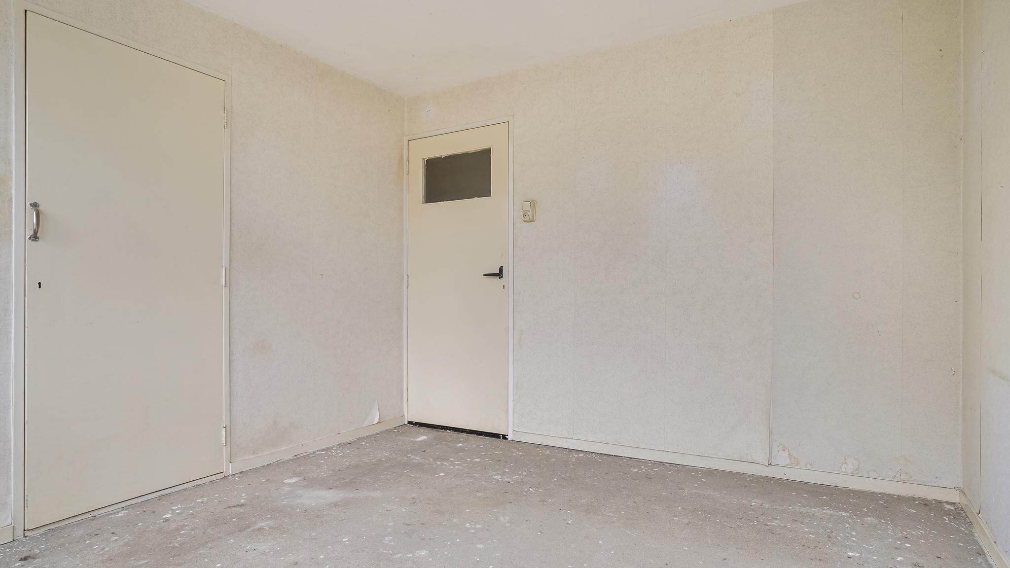 Slaapkamer 3 aan voorzijde met een muurkast en afgewerkt met een betonvloer, gesausde wanden en een pleisterwerk plafond.