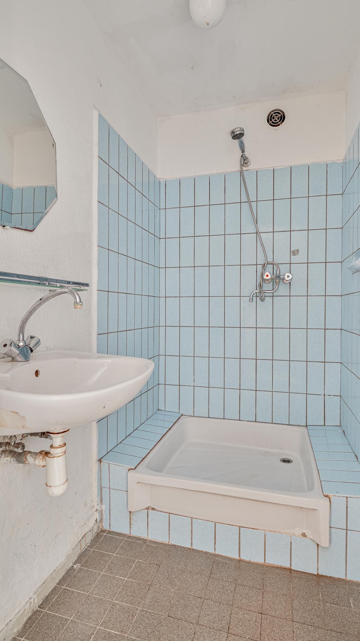 Deels betegelde badkamer voorzien van een wastafel en open douche ruimte.