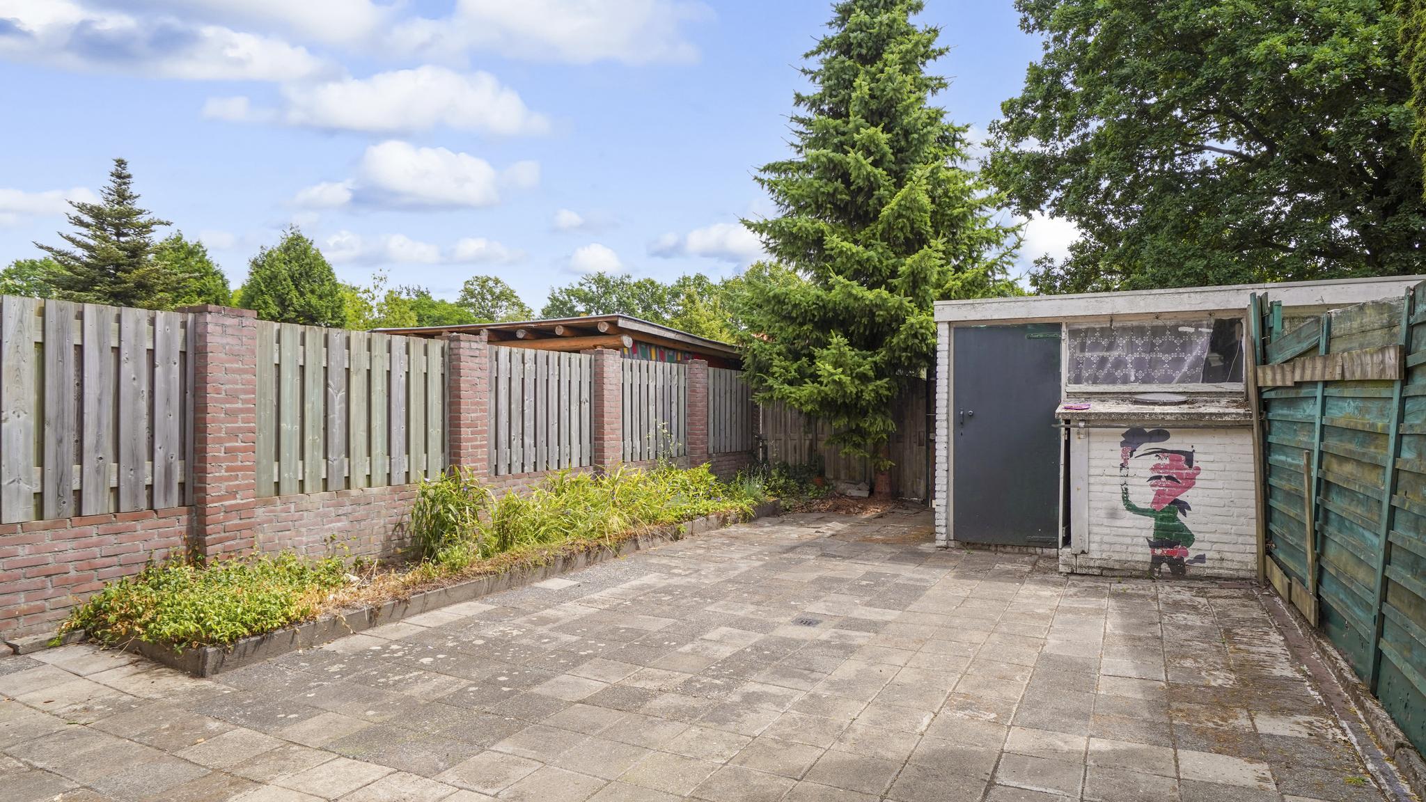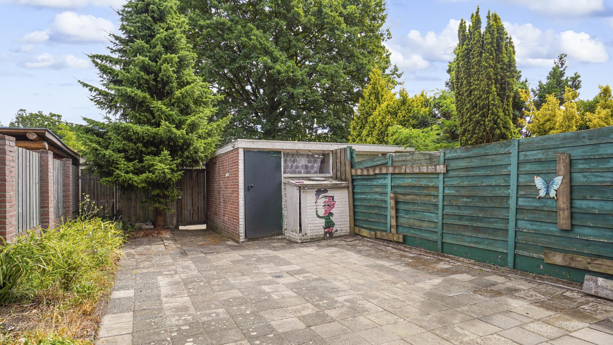 De diepe achtertuin van circa 12.45 meter diep met afsluitbare achterom is aangelegd met tegelwerk en diverse beplanting.