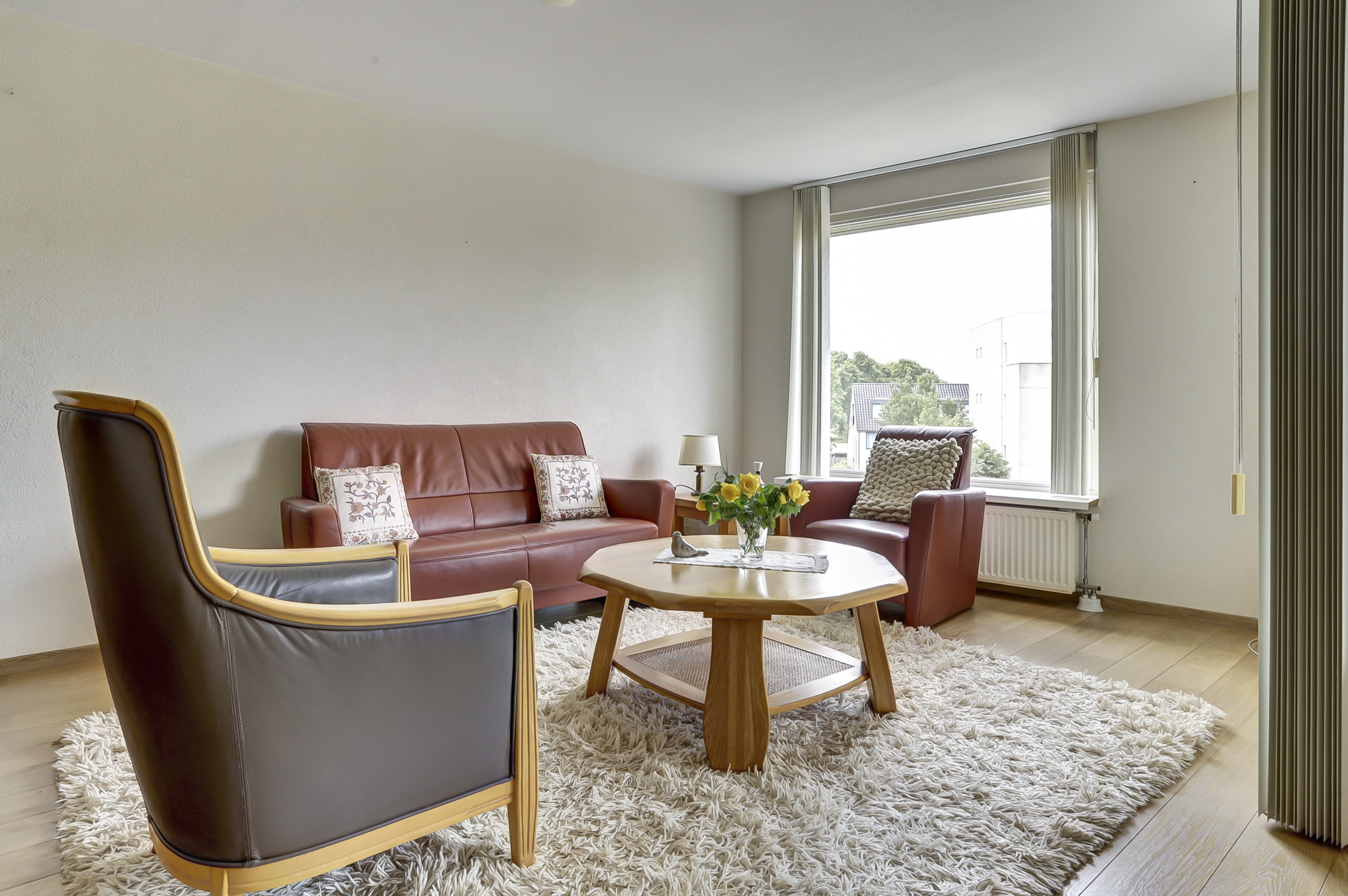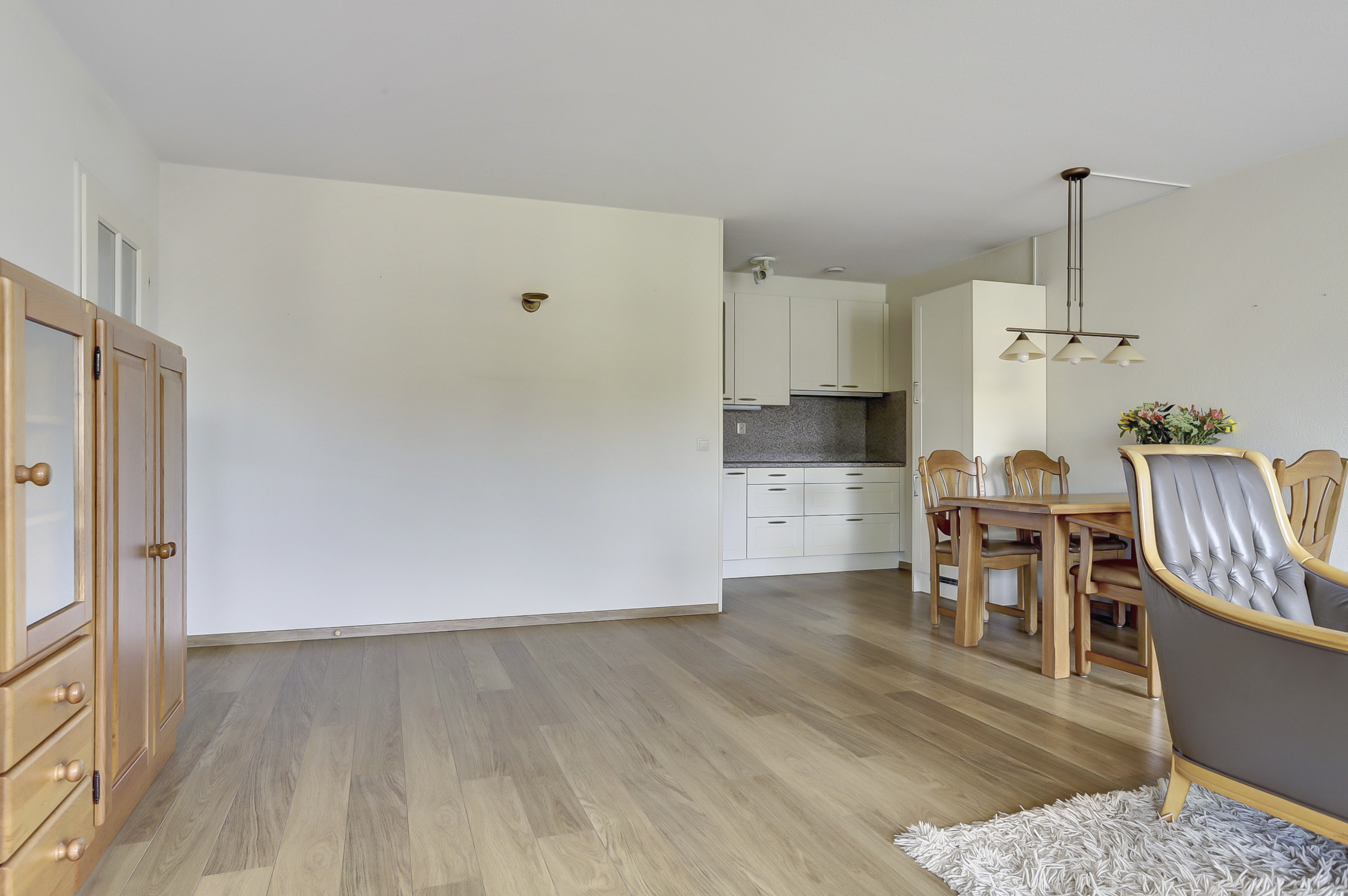 De gezellige living met veel daglichttoetreding is afgewerkt met een nette laminaatvloer, stucwerk (spachtelputz) wanden en een spuitwerk plafond.