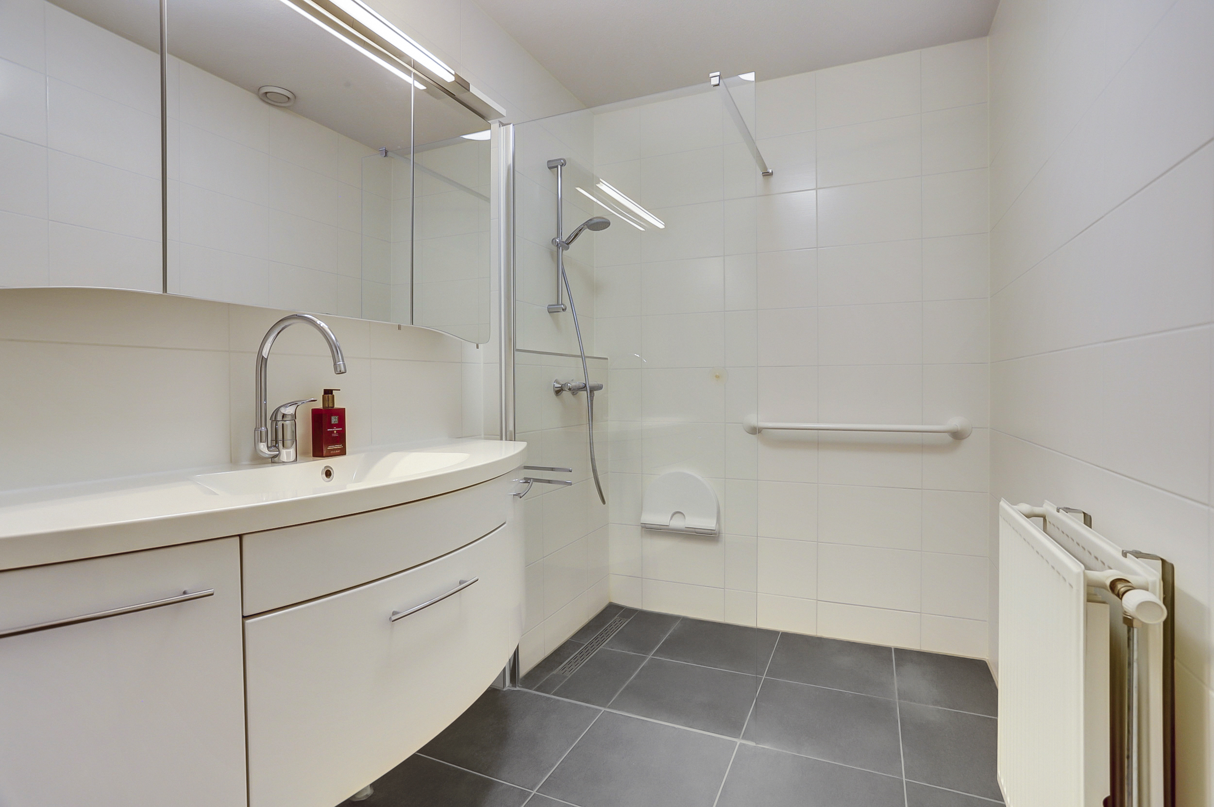 De moderne en recent vernieuwde en geheel betegelde badkamer is voorzien van een badmeubel met wastafel en een ruime inloopdouche met thermostaatkraan.
