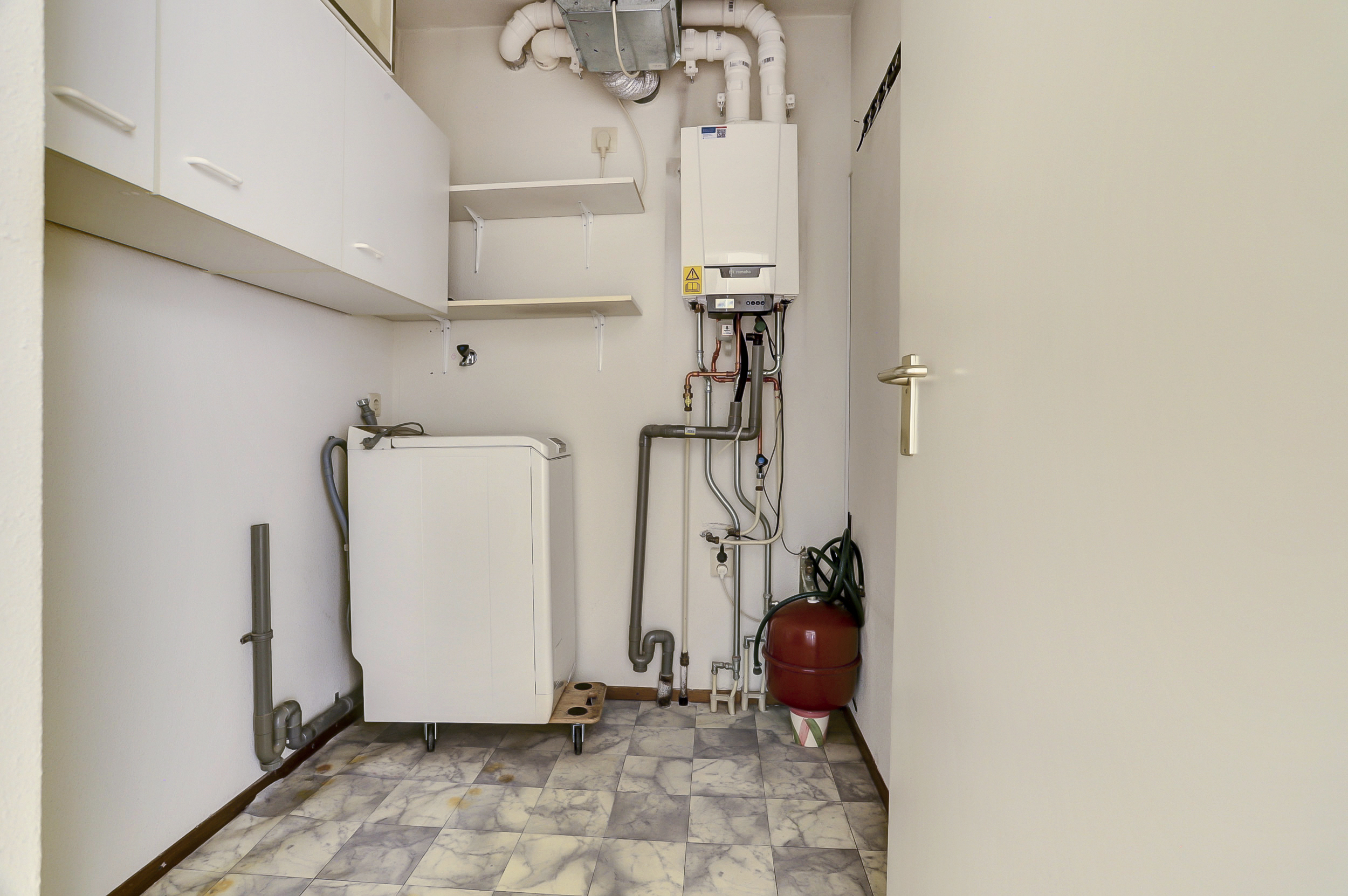 Interne berging met de aansluiting t.b.v. wasapparatuur, unit t.b.v. de mechanische ventilatie en de opstelling van de Remeha HR c.v. combiketel uit 2018.
