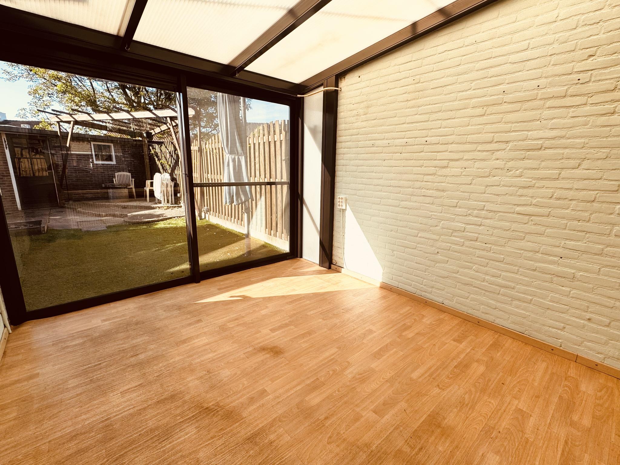 Gezellige serre van circa 11 m² met een schuifpui naar de achtertuin en afgewerkt met een vinylvloer.
