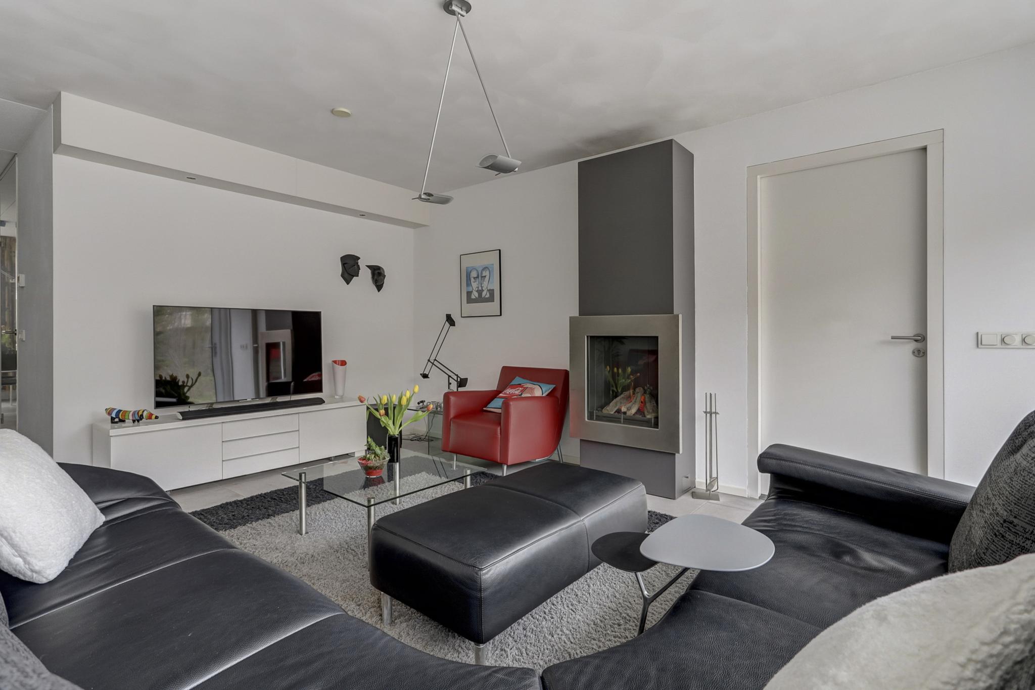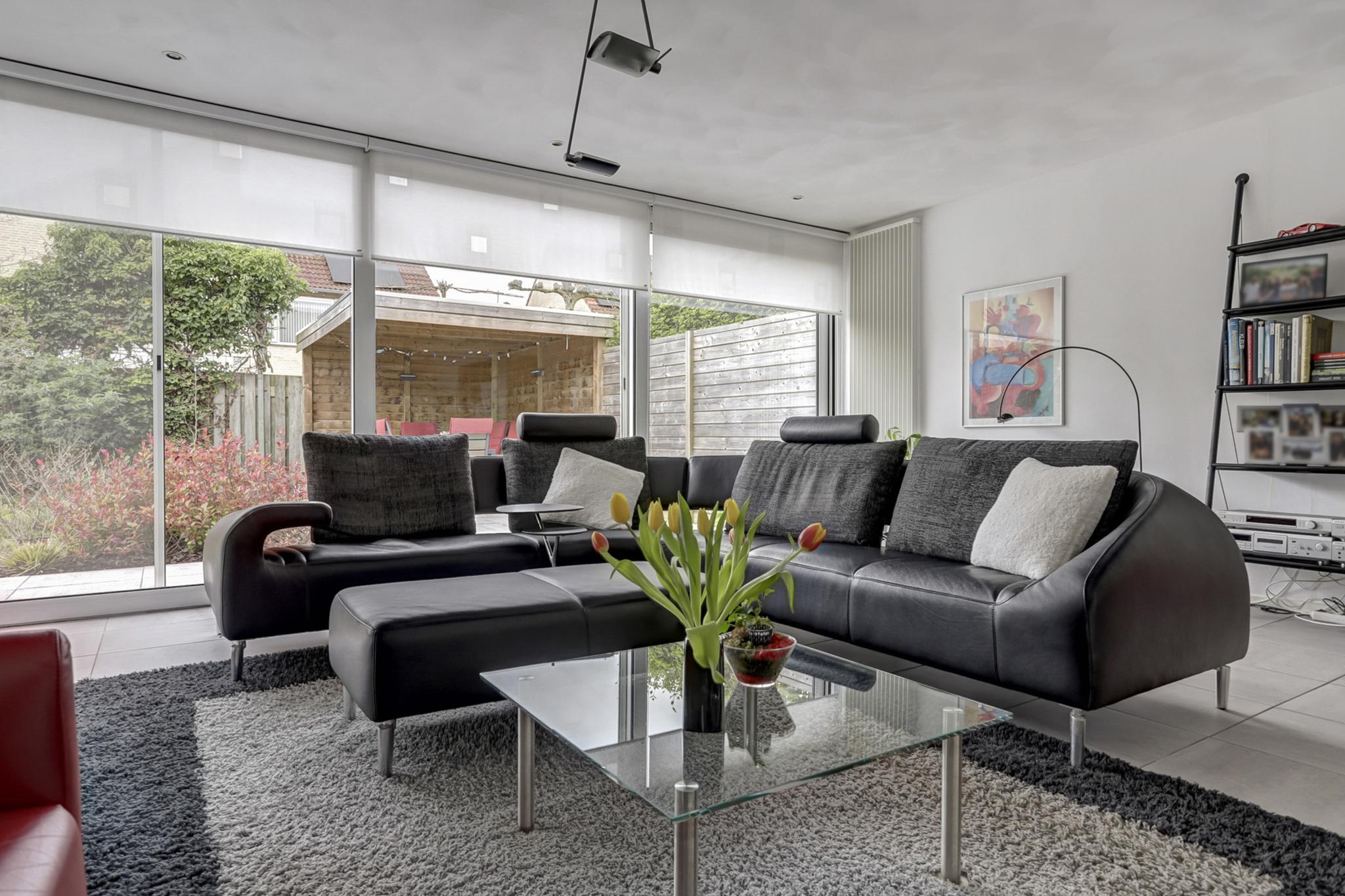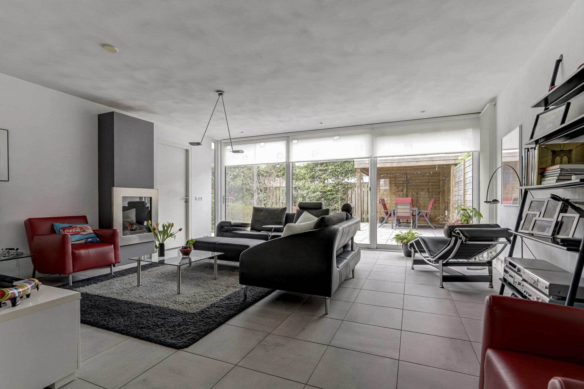 De royale uitgebouwde living met een sfeervolle moderne gashaard, 3 traps schuifpui en de kamer is afgewerkt met een tegelvloer voorzien van vloerverwarming, stucwerk wanden en een spuitwerk- deels fijn schuurwerk plafond.