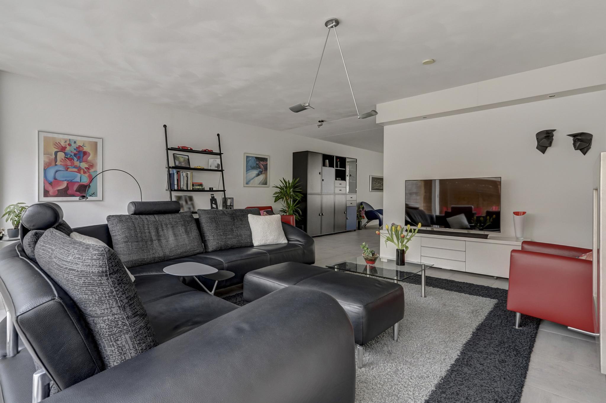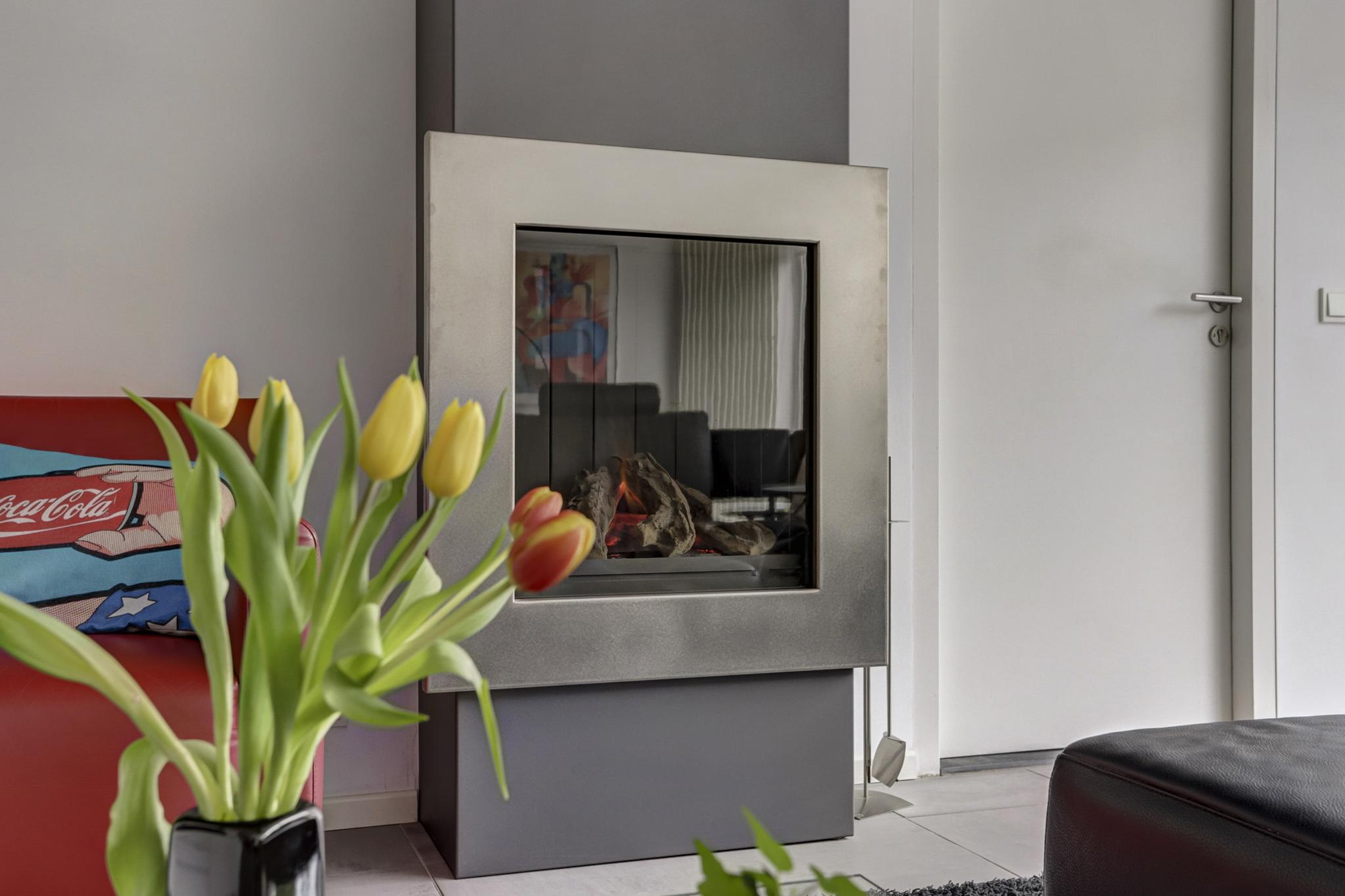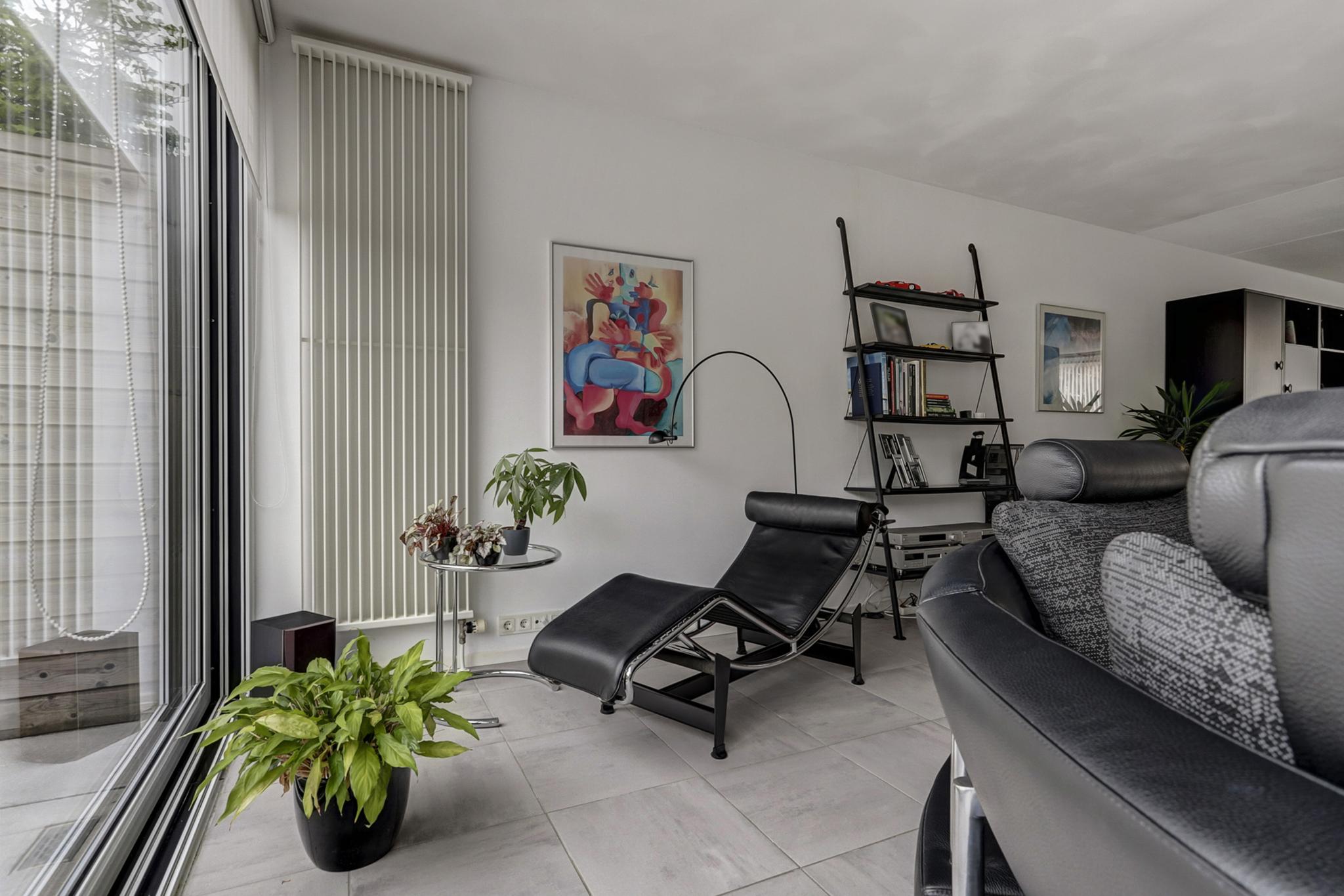 De royale uitgebouwde living met een sfeervolle moderne gashaard, 3 traps schuifpui en de kamer is afgewerkt met een tegelvloer voorzien van vloerverwarming, stucwerk wanden en een spuitwerk- deels fijn schuurwerk plafond.