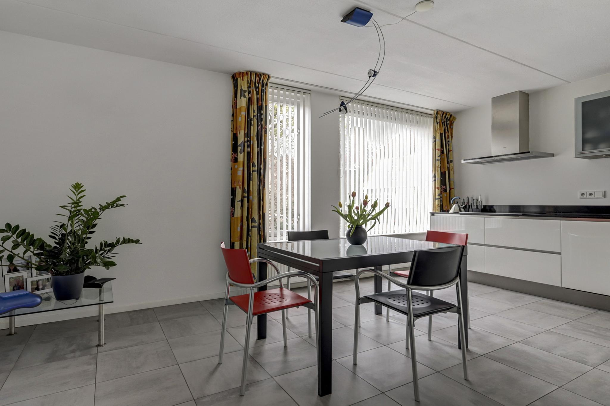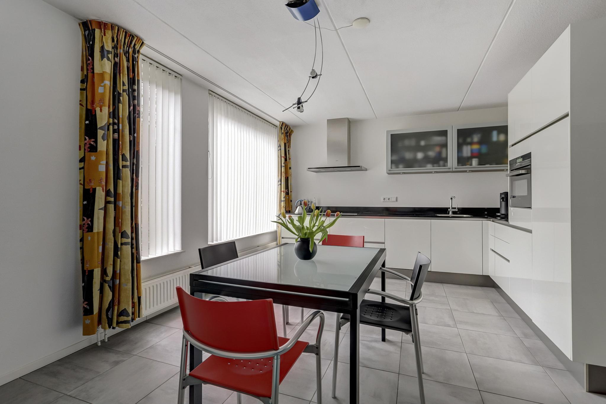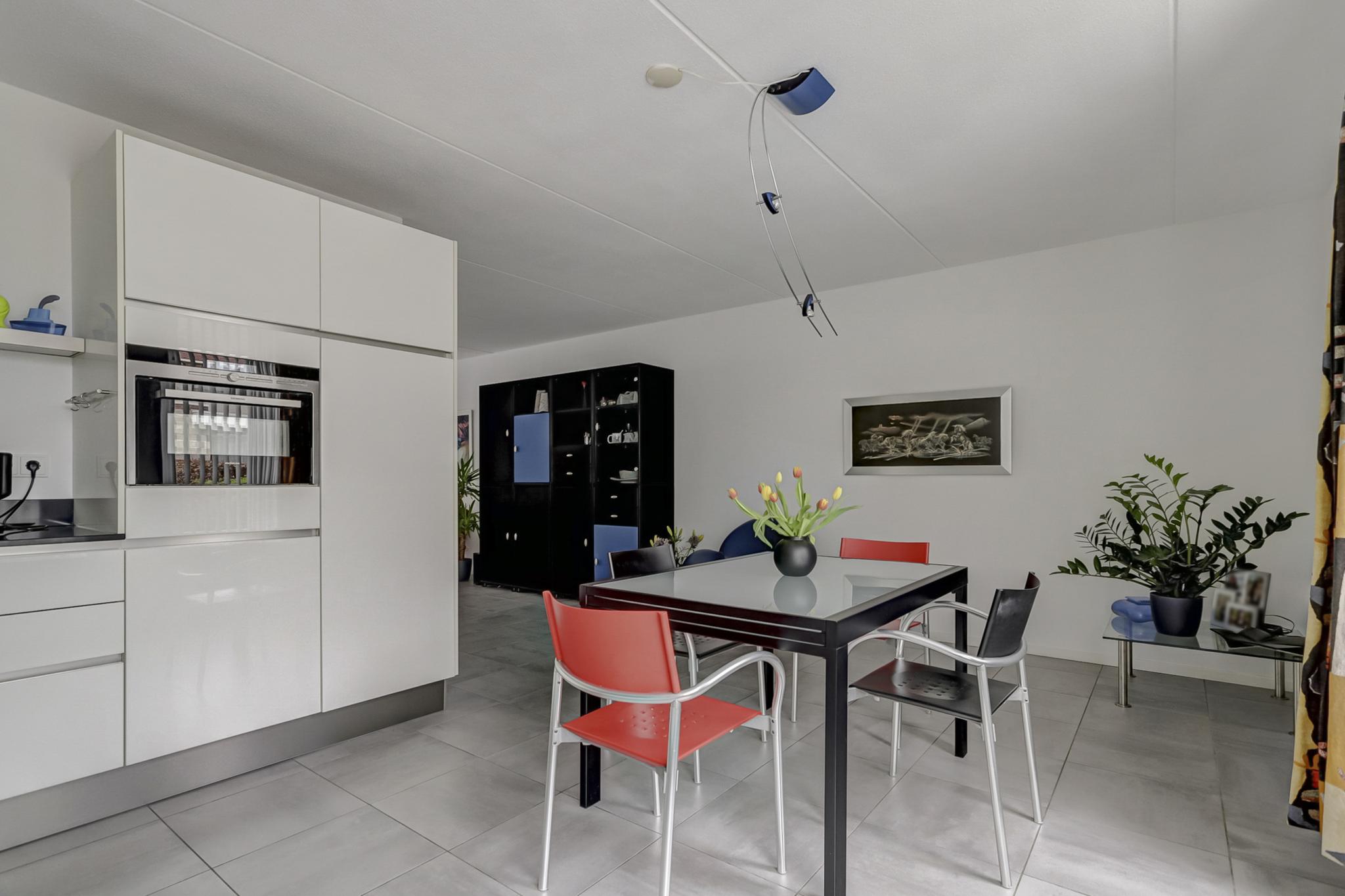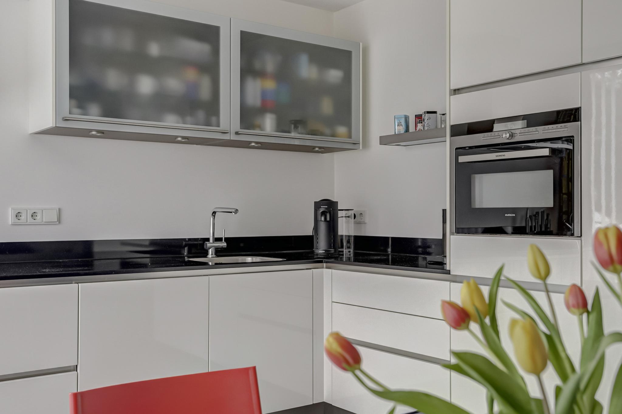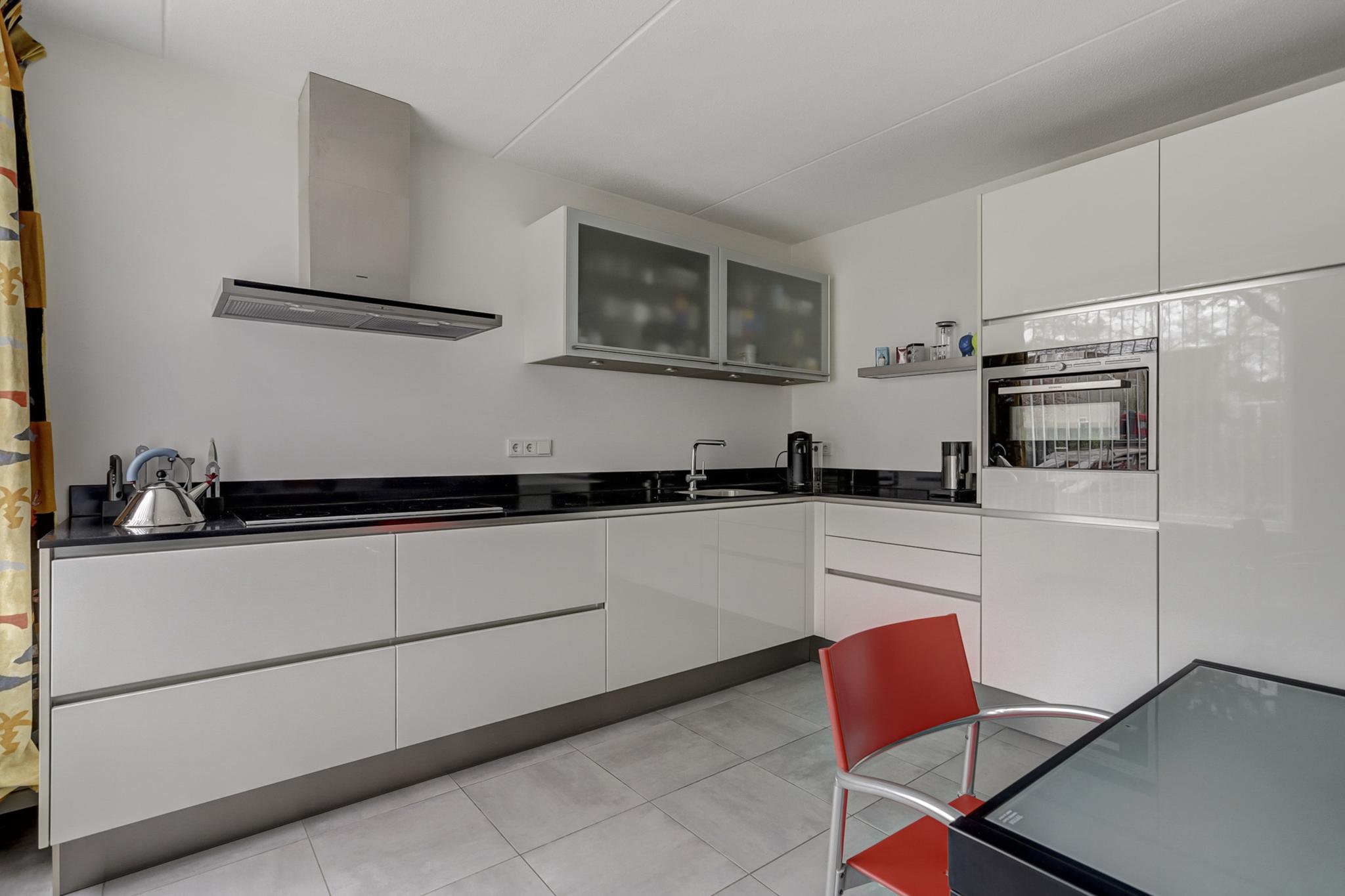 De open leefkeuken is afgewerkt met een tegelvloer voorzien van vloerverwarming en de eigentijdse kwaliteitskeuken is geplaatst in hoekopstelling en voorzien van laden en kasten, close-in boiler, composiet werkblad met rvs spoelbak, en hoogwaardige Siemens inbouwapparatuur als een vaatwasmachine, inductie kookplaat, afzuigkap, oven/magnetron combinatie en een koelkast.