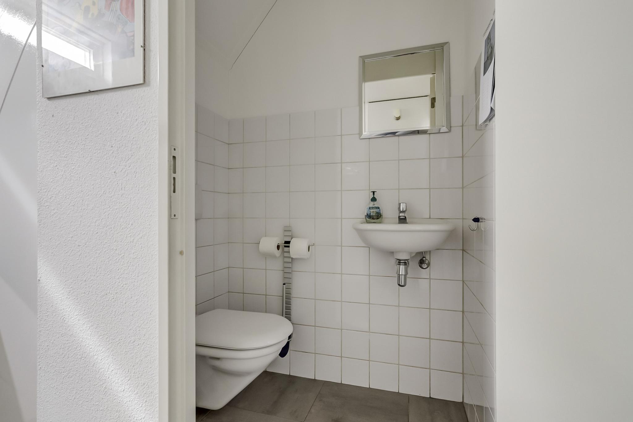 Deels betegelde toiletruimte met een zwevend closet en een fonteintje.