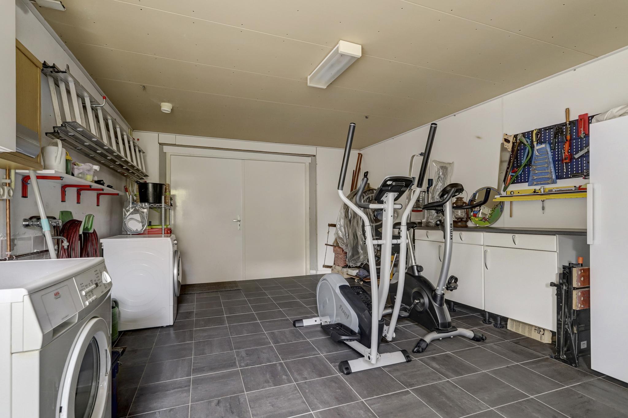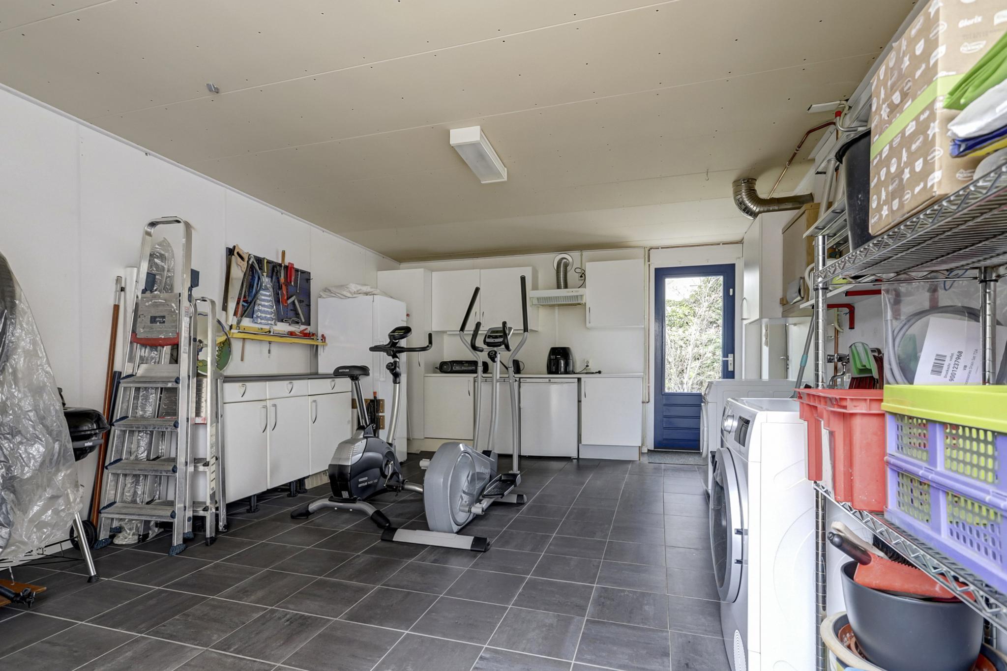 Aanpandige ruime geïsoleerde garage met een aansluiting t.b.v. wasapparatuur, stortbakje, praktisch keukenblok en de garage is afgewerkt met een nette tegelvloer.