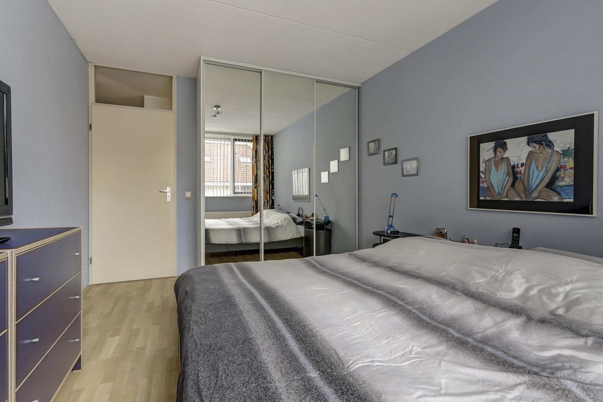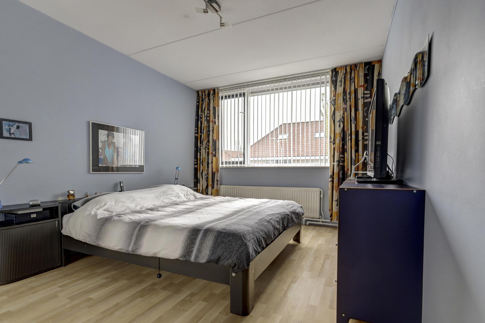 Slaapkamer 1 aan voorzijde is afgewerkt met een laminaatvloer, behangen wanden en een spuitwerk plafond.