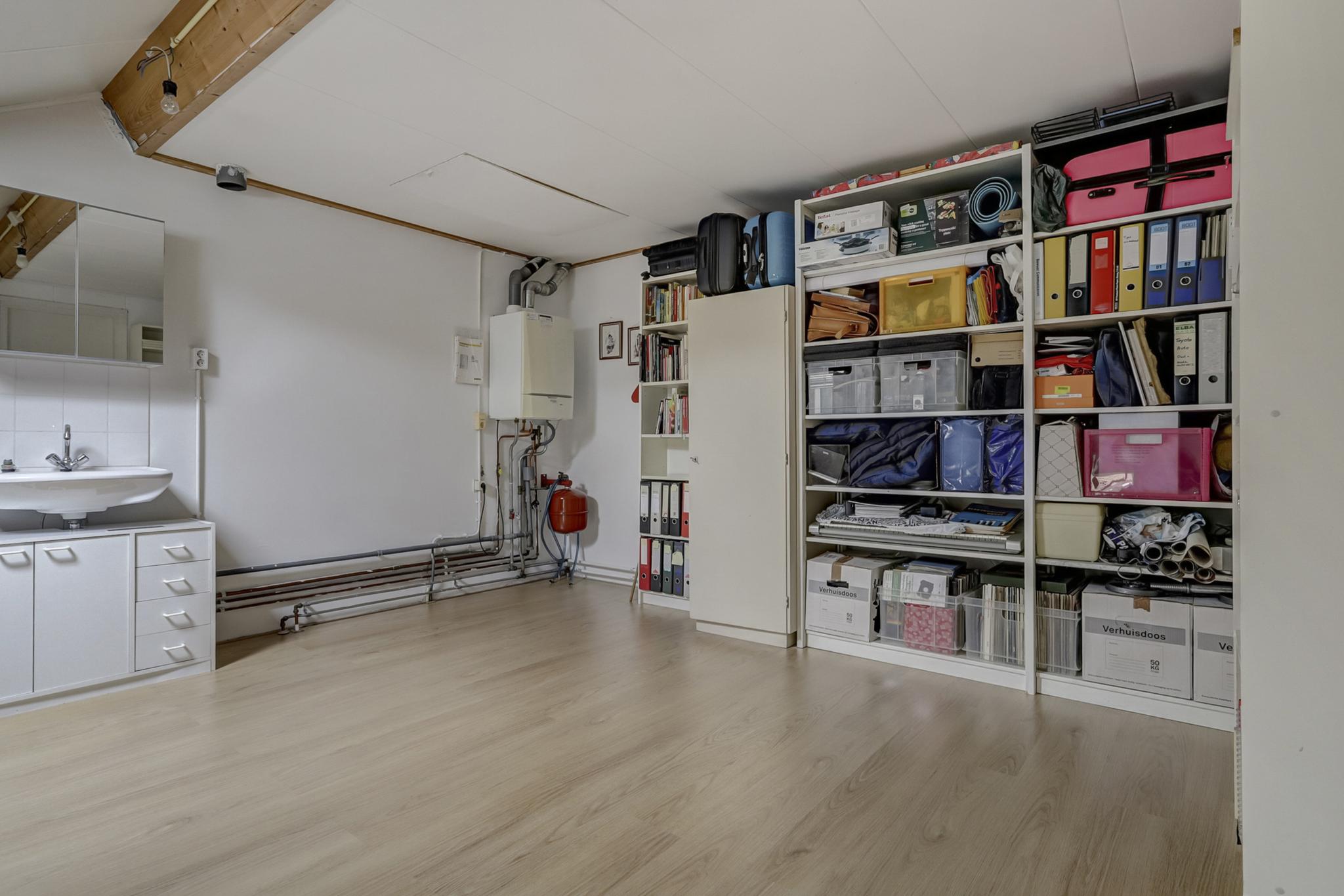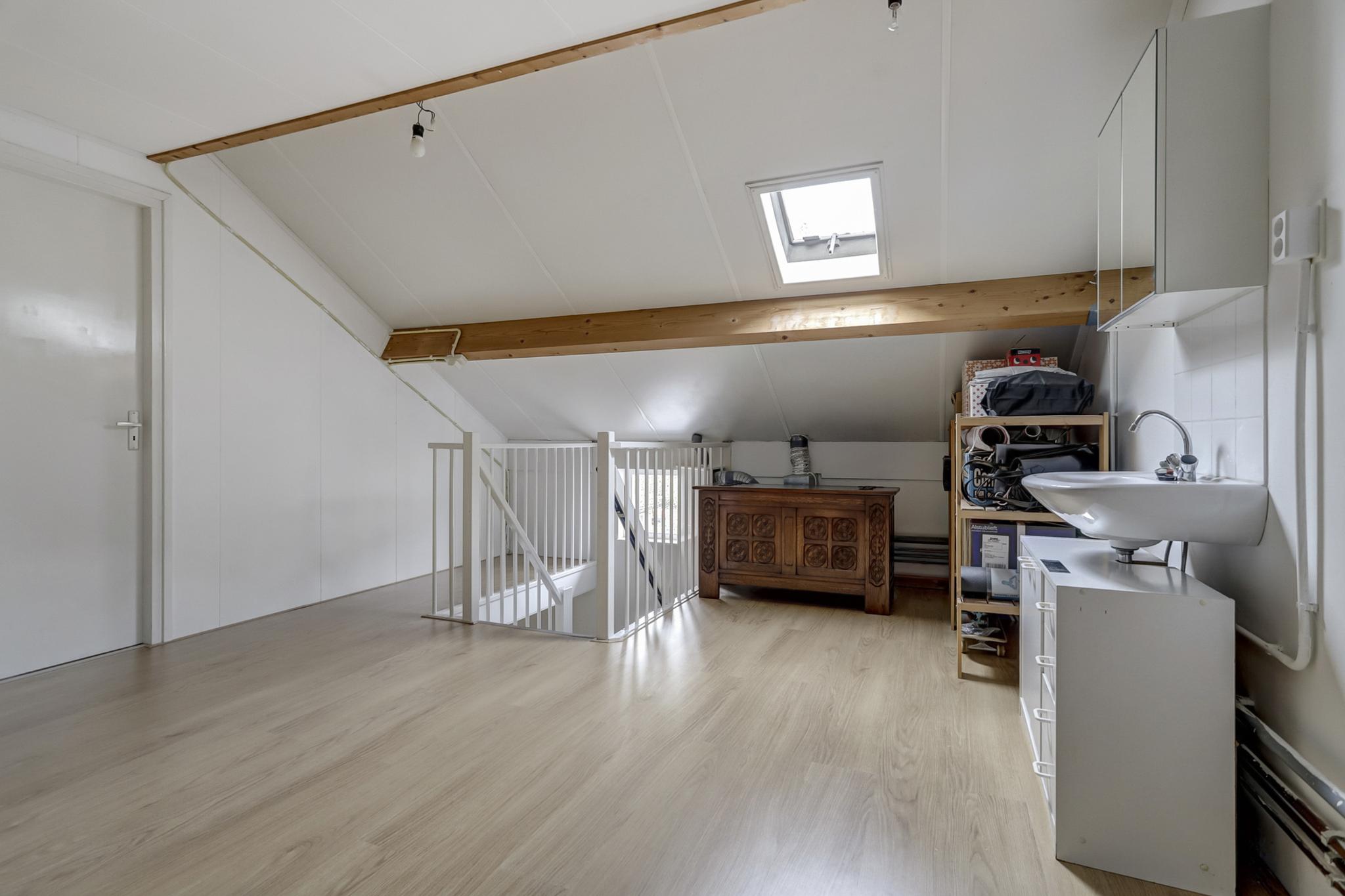 Ruime voorzolder met een wastafel, opstelling van de HR c.v. combiketel van Remeha (2009), dakvenster en afgewerkt met een laminaatvloer.