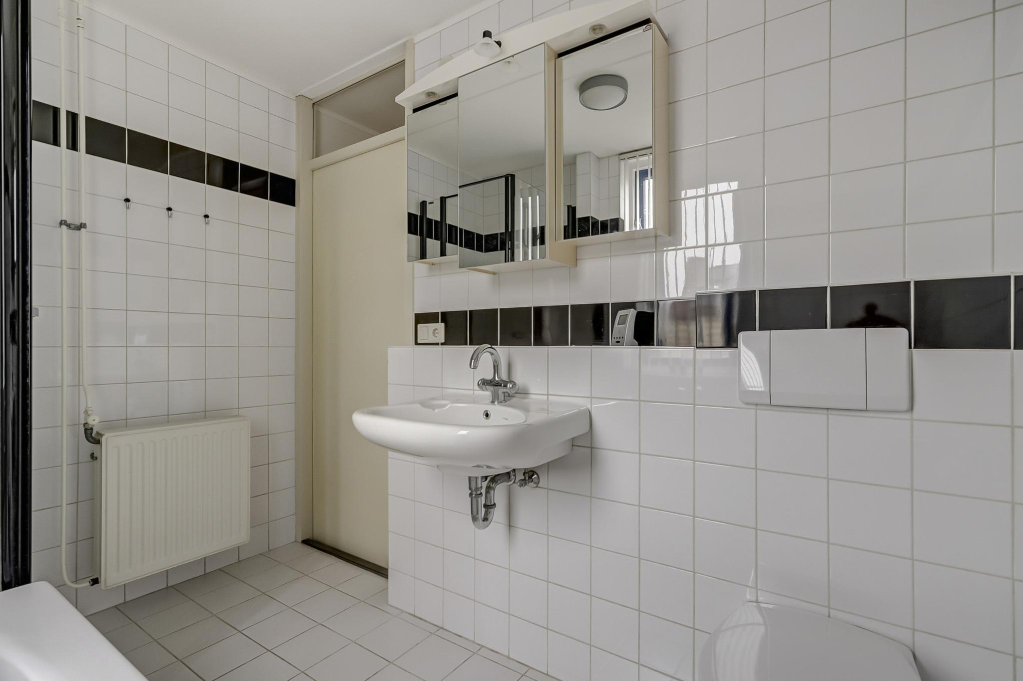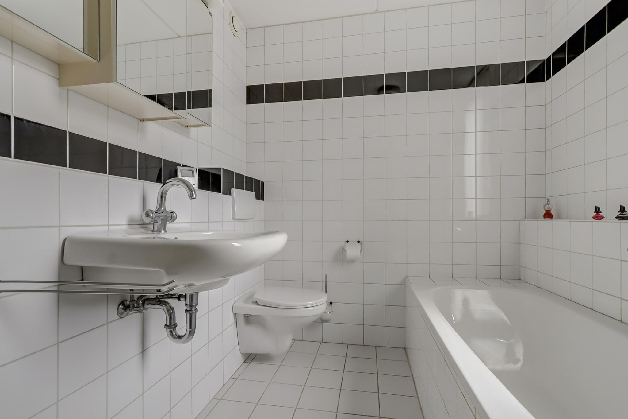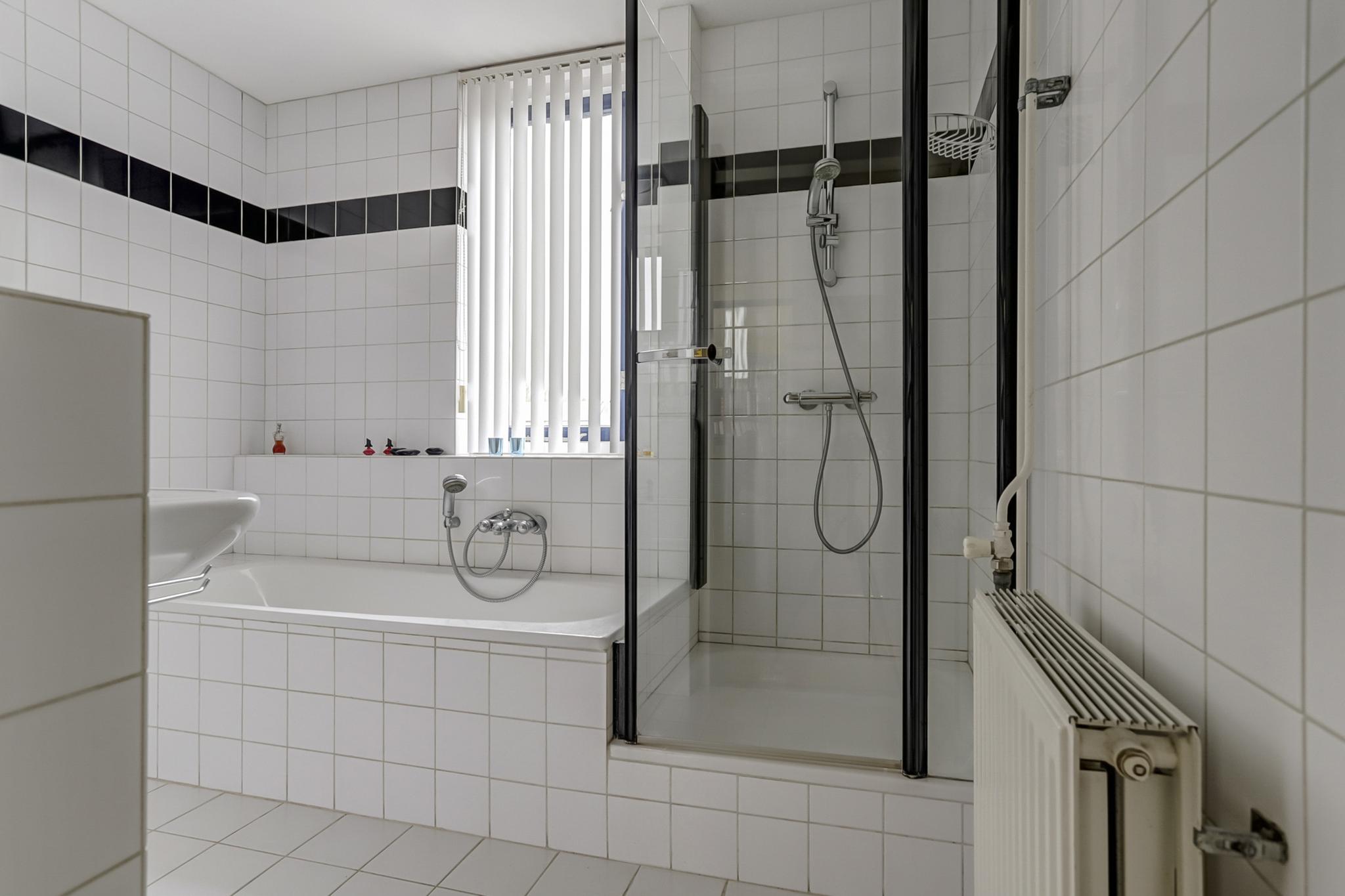 Betegelde badkamer voorzien van een ligbad, wastafel, zwevend closet en een separate douchecabine met thermostaatkraan.