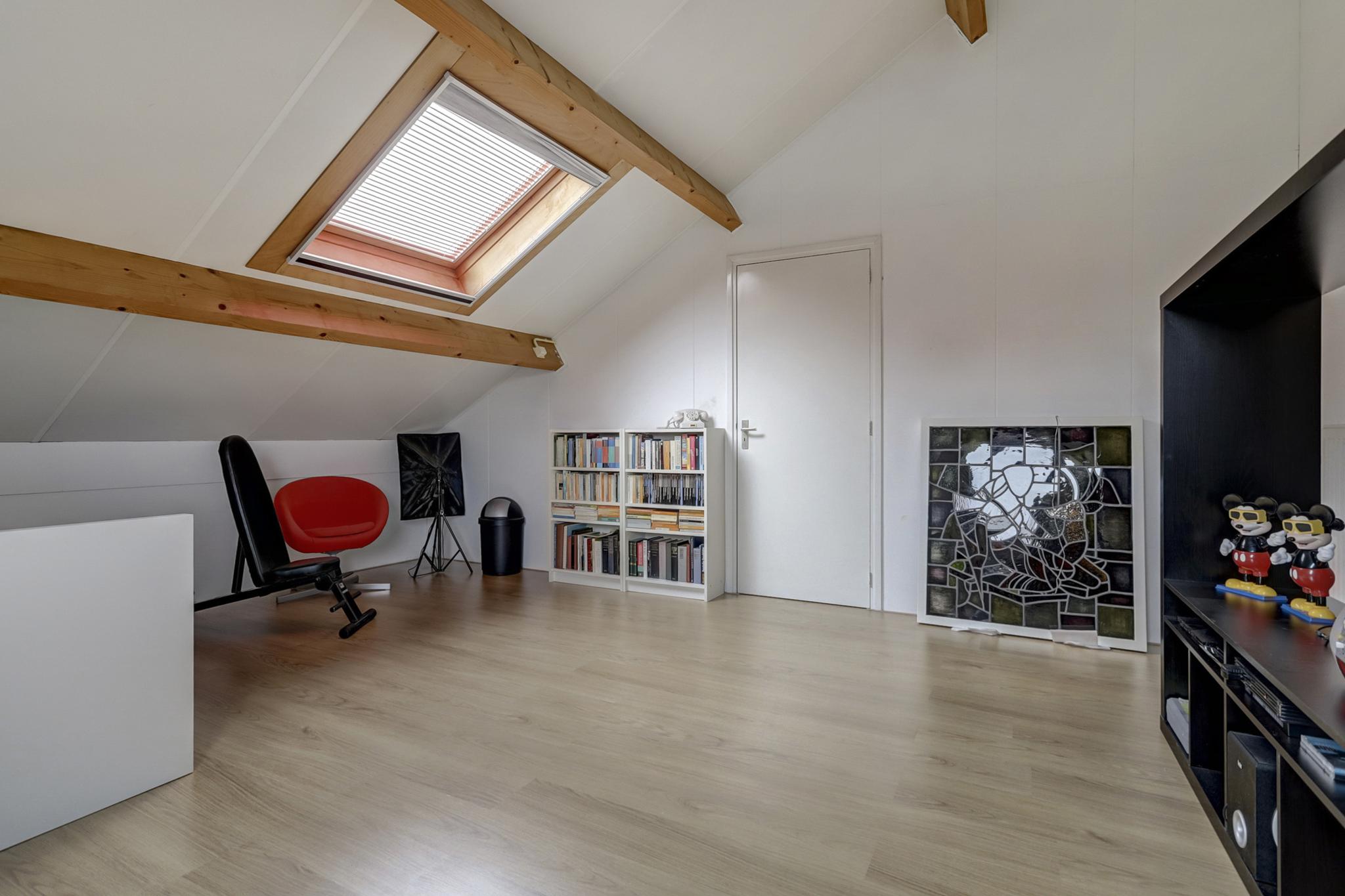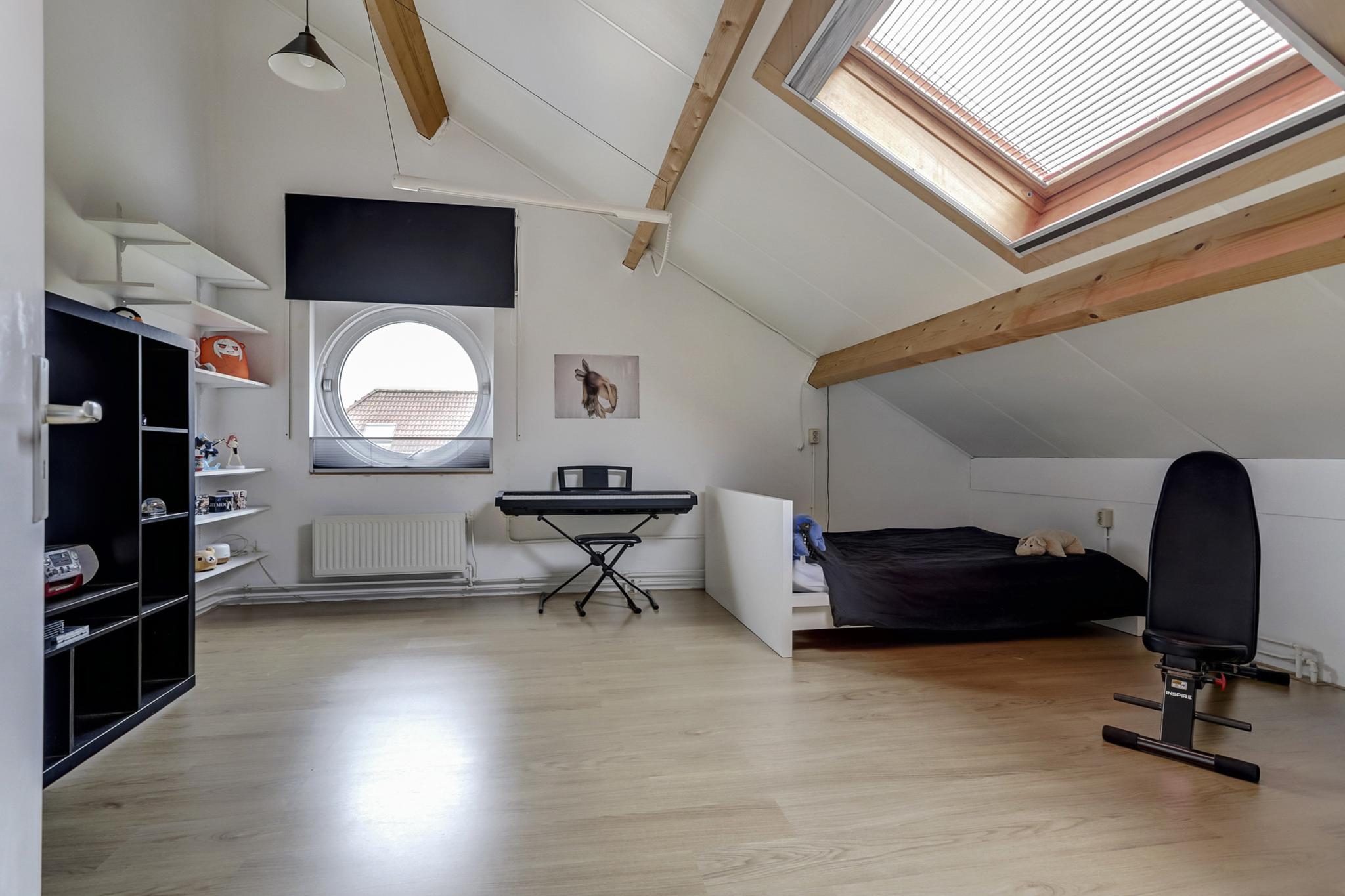Slaapkamer 4 betreft een grote zolderkamer met een gevel en een dakraam en afgewerkt met een laminaatvloer en pleisterwerk wanden.