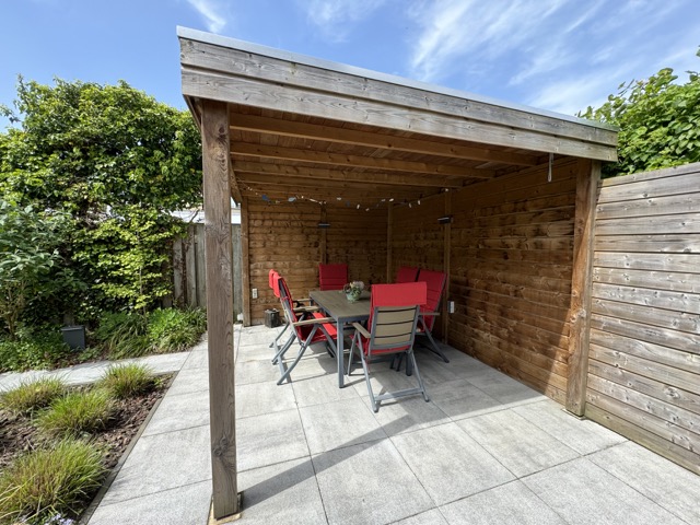 Mooie houten terrasoverkapping met elektrapunten.