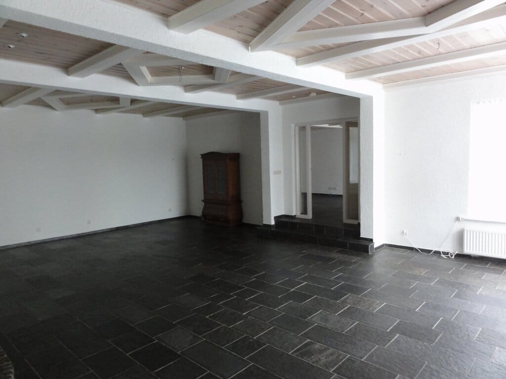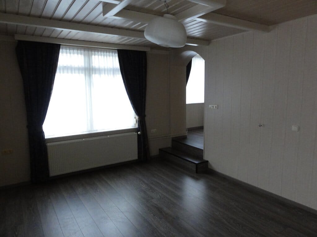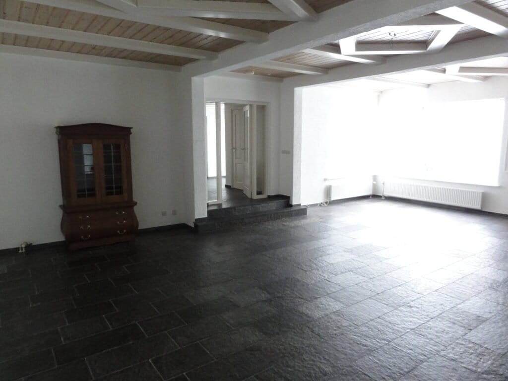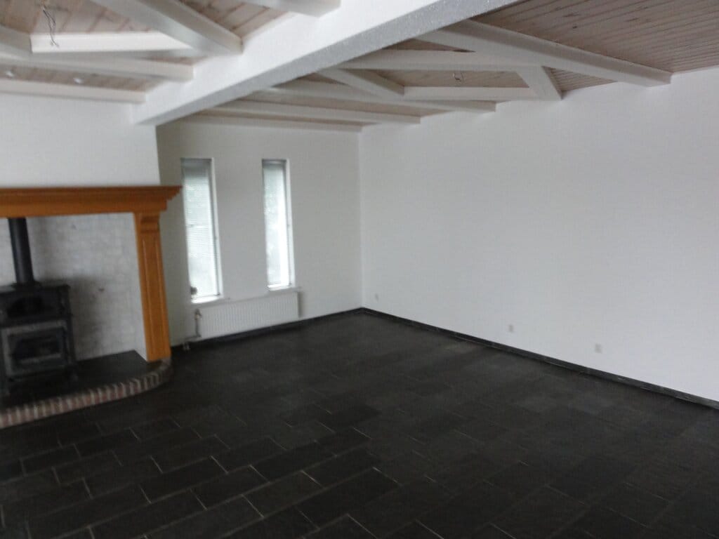 De riante sfeervolle living is voorzien van grote raampartijen welke zorgen voor veel natuurlijke lichtinval, gezellige schouw met houtkachel en openslaande tuindeuren naar de tuin. De kamer is afgewerkt met een leistenen vloer, stucwerk wanden en balken plafond.