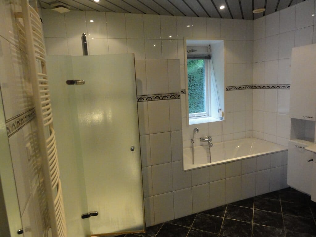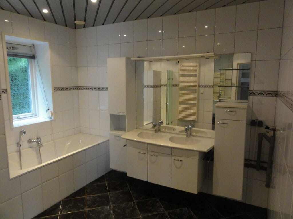 Modern betegelde badkamer met vloerverwarming en voorzien van een design radiator, ligbad, separate douchecabine (thermostaatkraan) en badmeubel met dubbele wastafel.