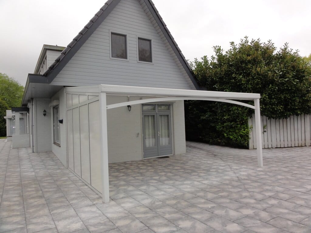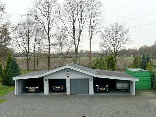 Bijgebouw met dubbele garage, carport aan weerszijden, verblijfsruimte en vliering.