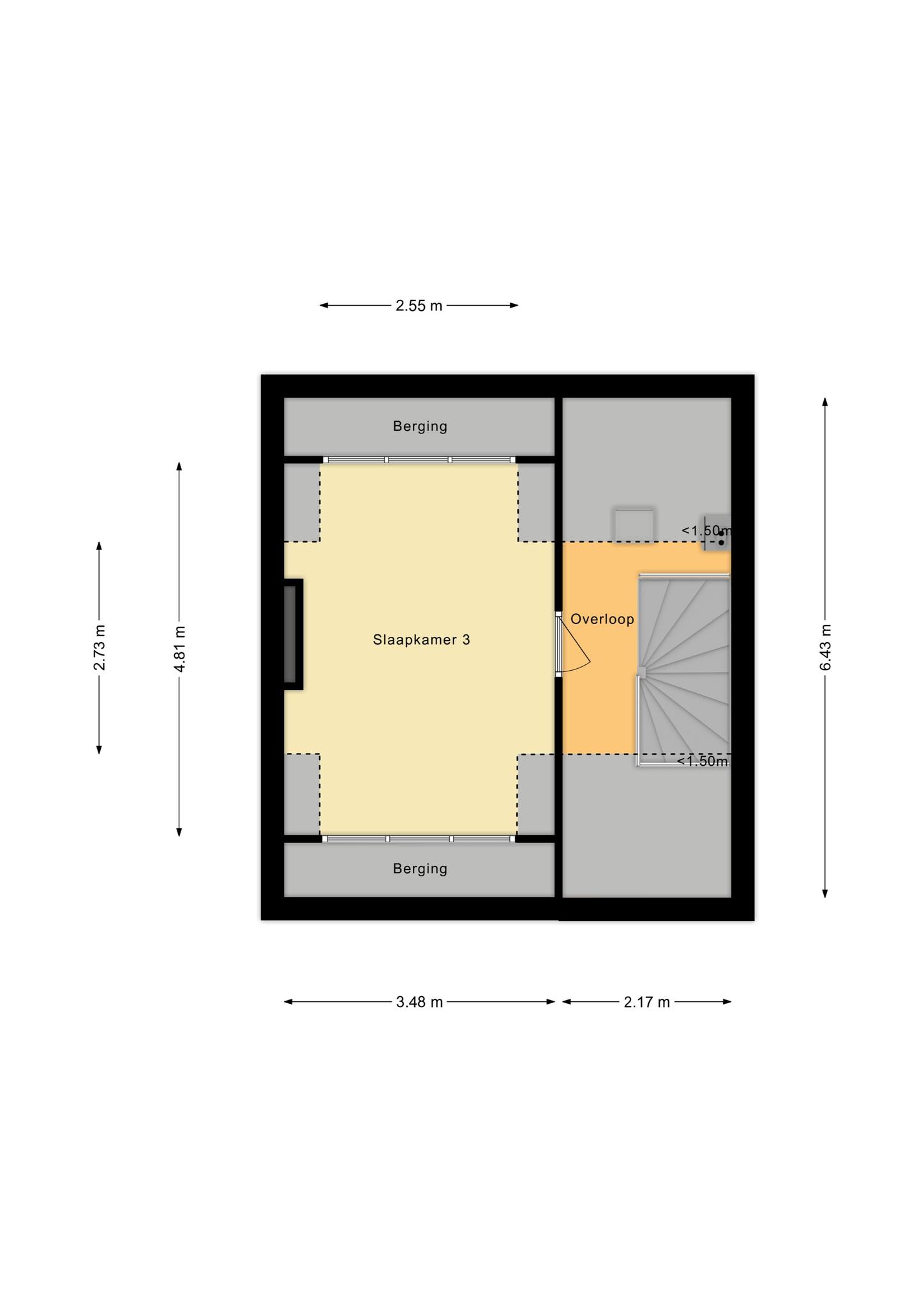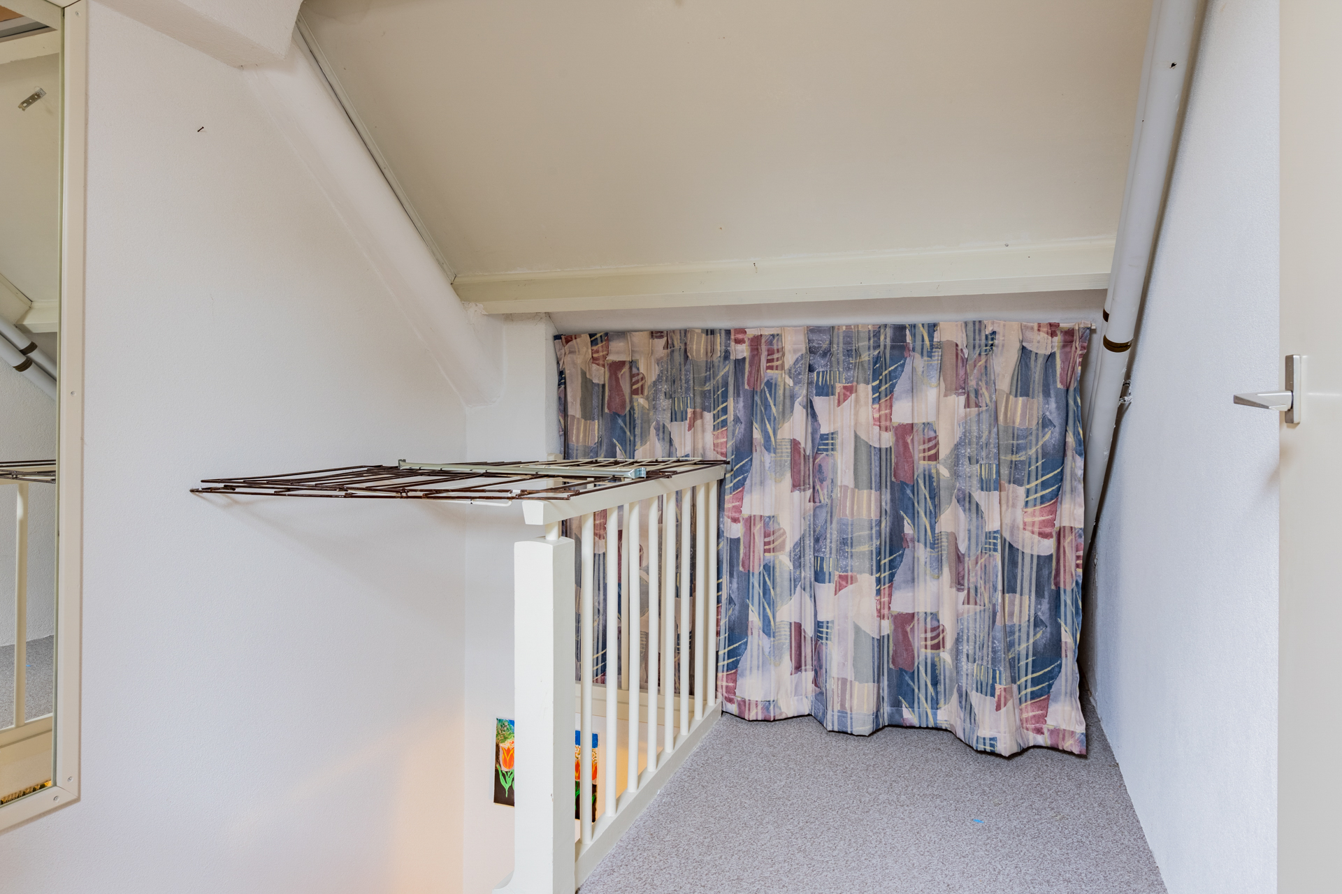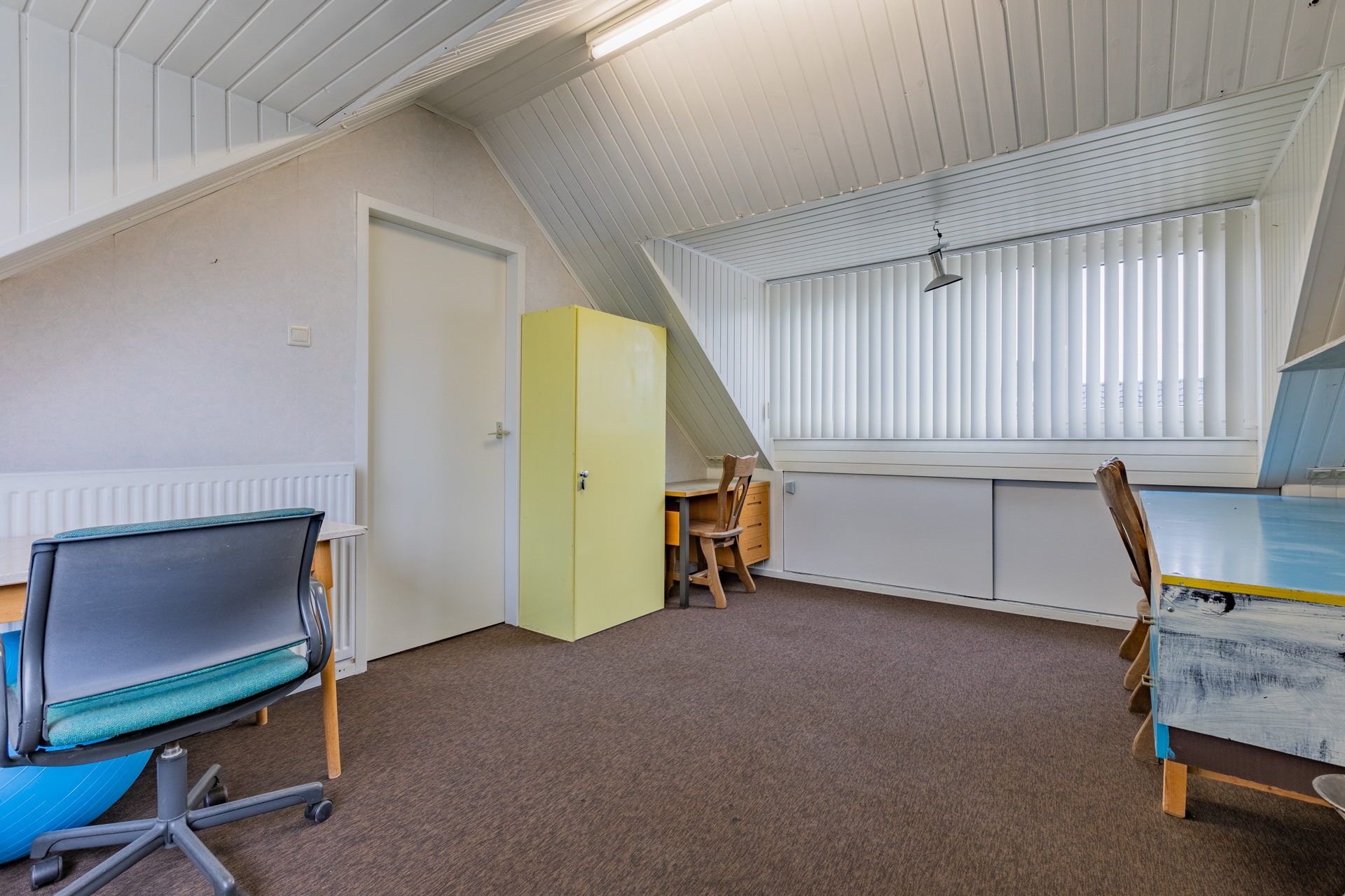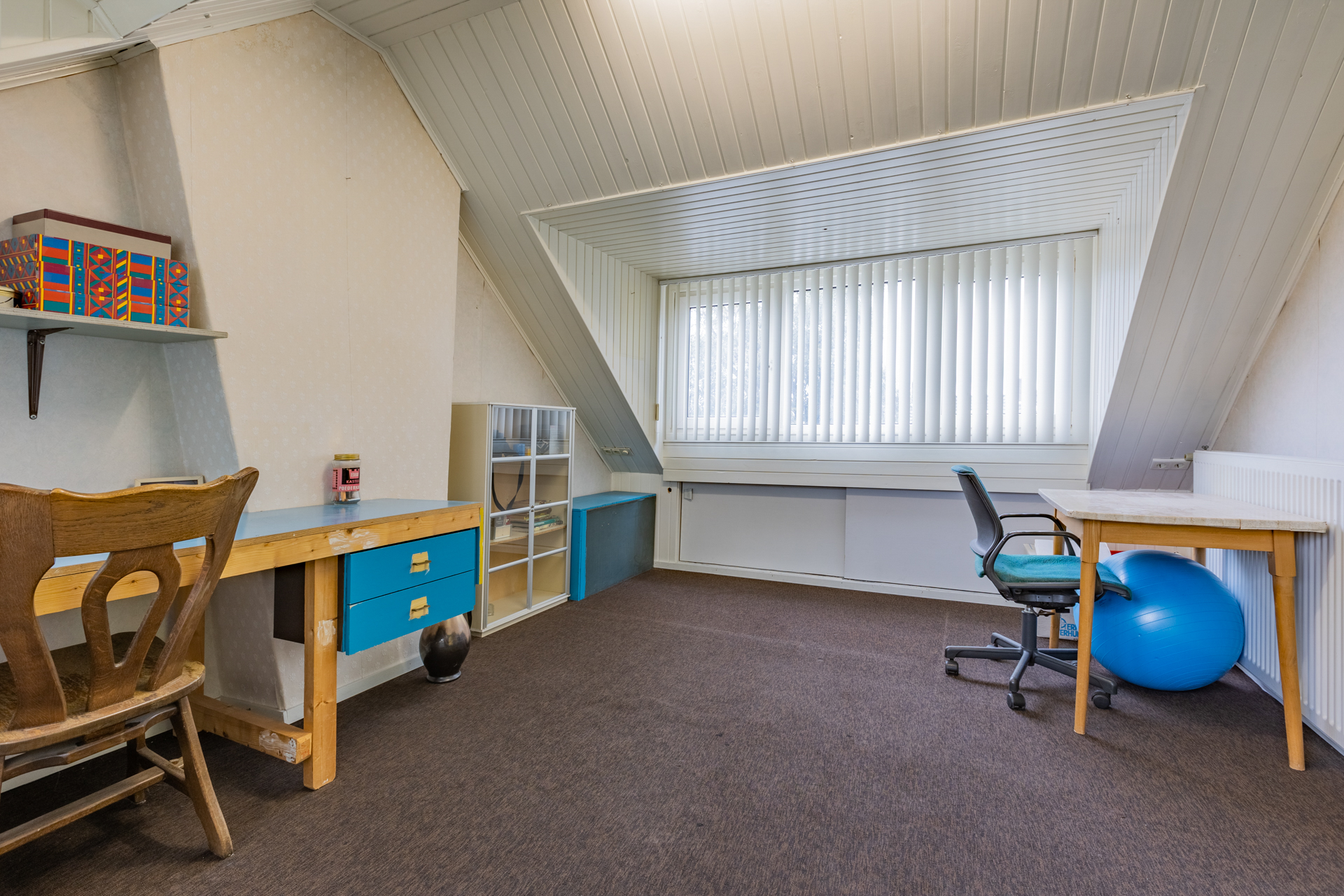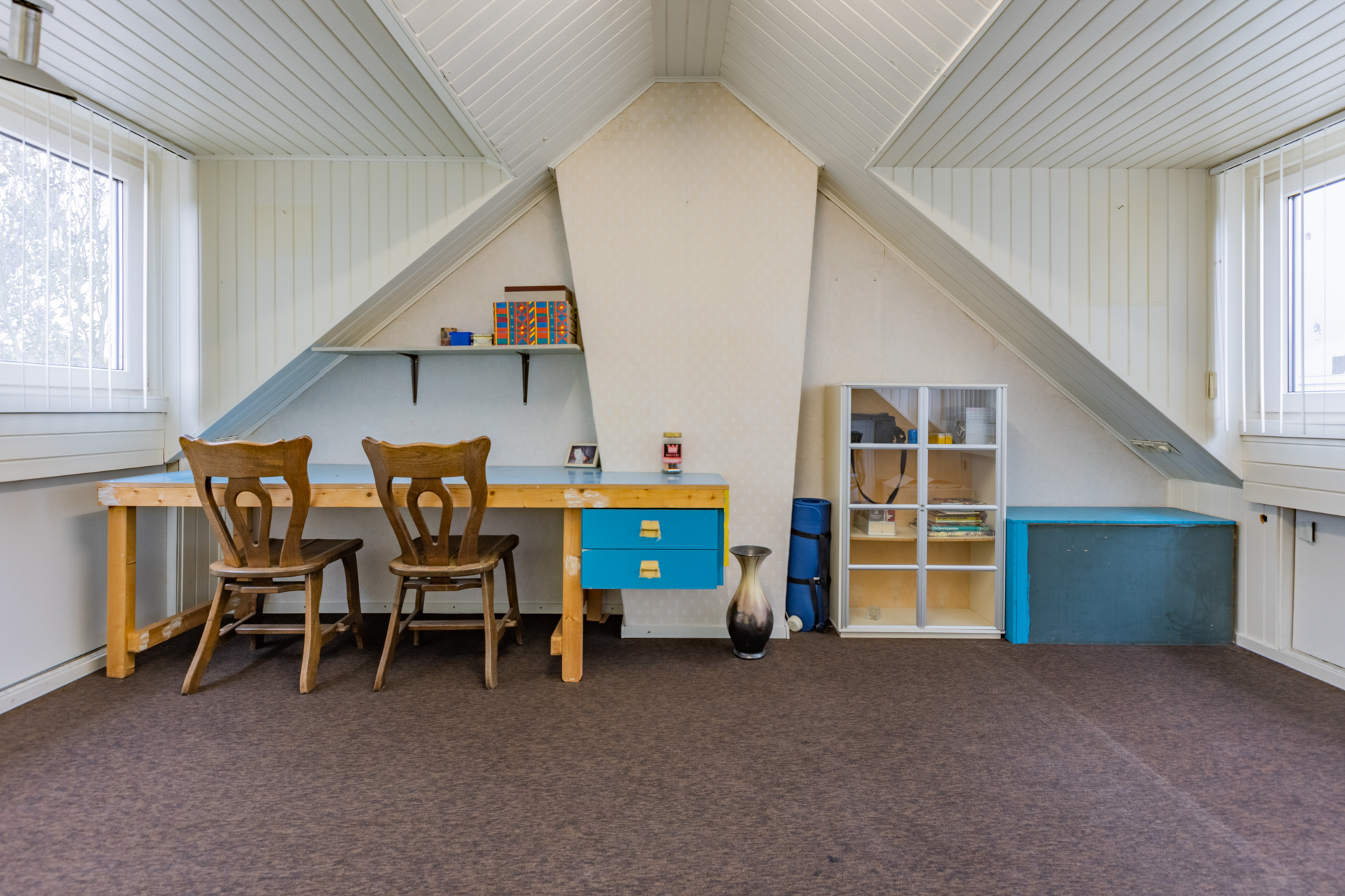 De ruime zolderslaapkamer 3 met aan weerszijden van de kap een in kunststof uitgevoerd dakkapel, bergkasten onder de schuinte van de kap en een betonnen vloerenconstructie.