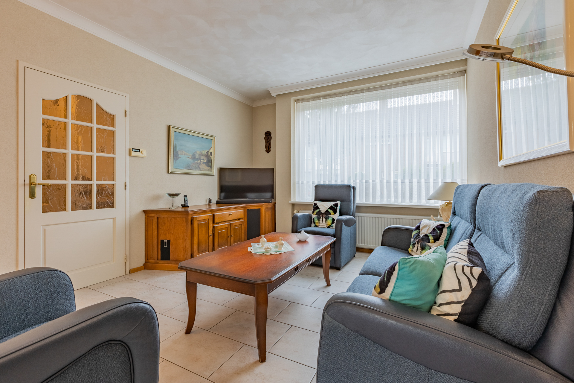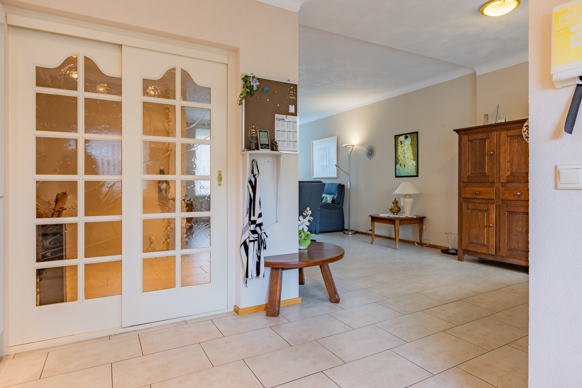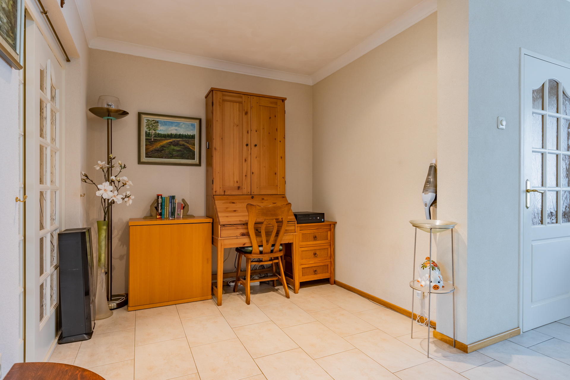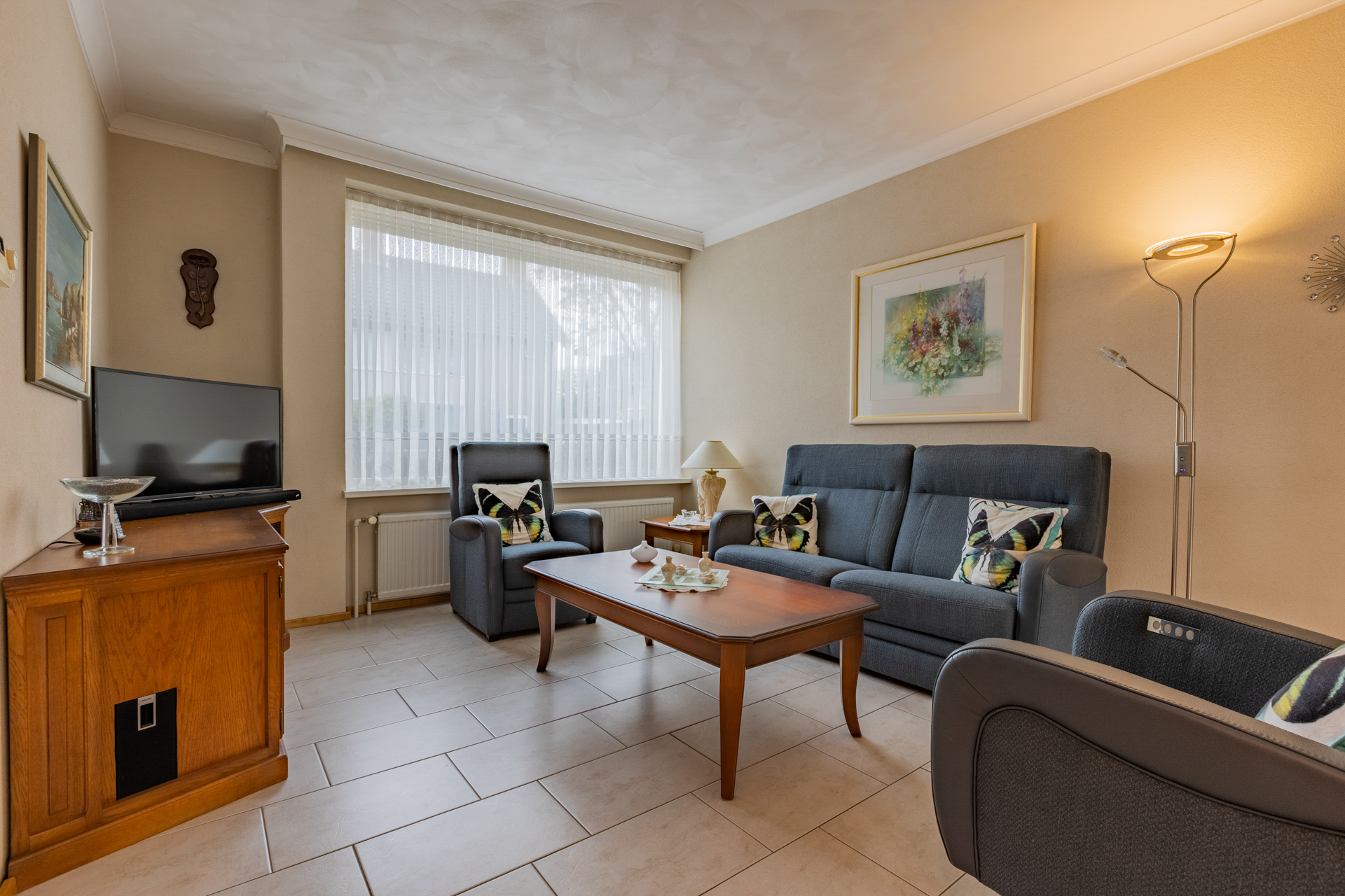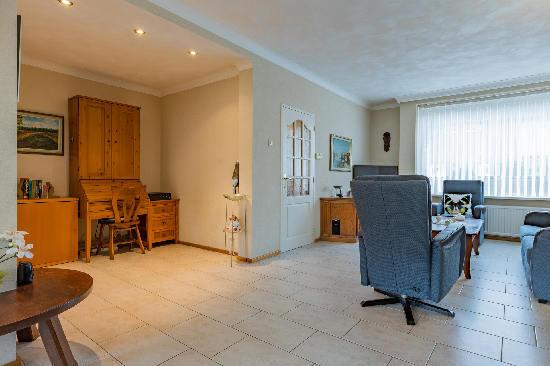 De uitgebouwde living is afgewerkt met een nette tegelvloer voorzien van vloerverwarming, stucwerk wanden en een fijn schuurwerk plafond.