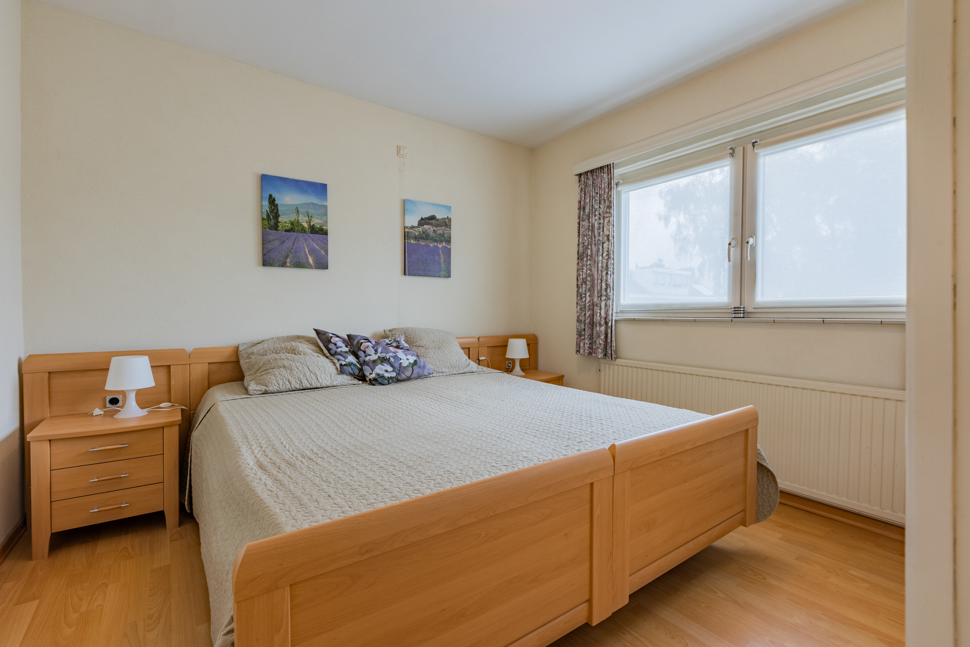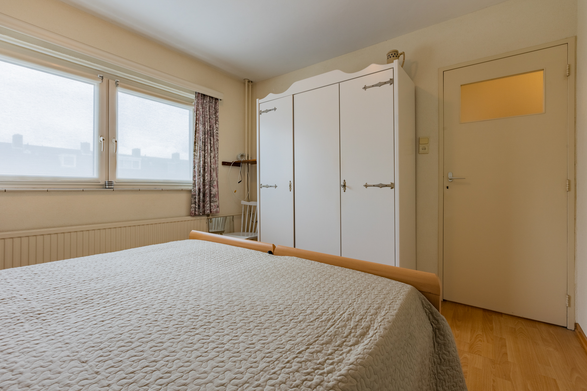Slaapkamer 1 aan achterzijde is afgewerkt met een laminaatvloer, stucwerk wanden en een pleisterwerk plafond.