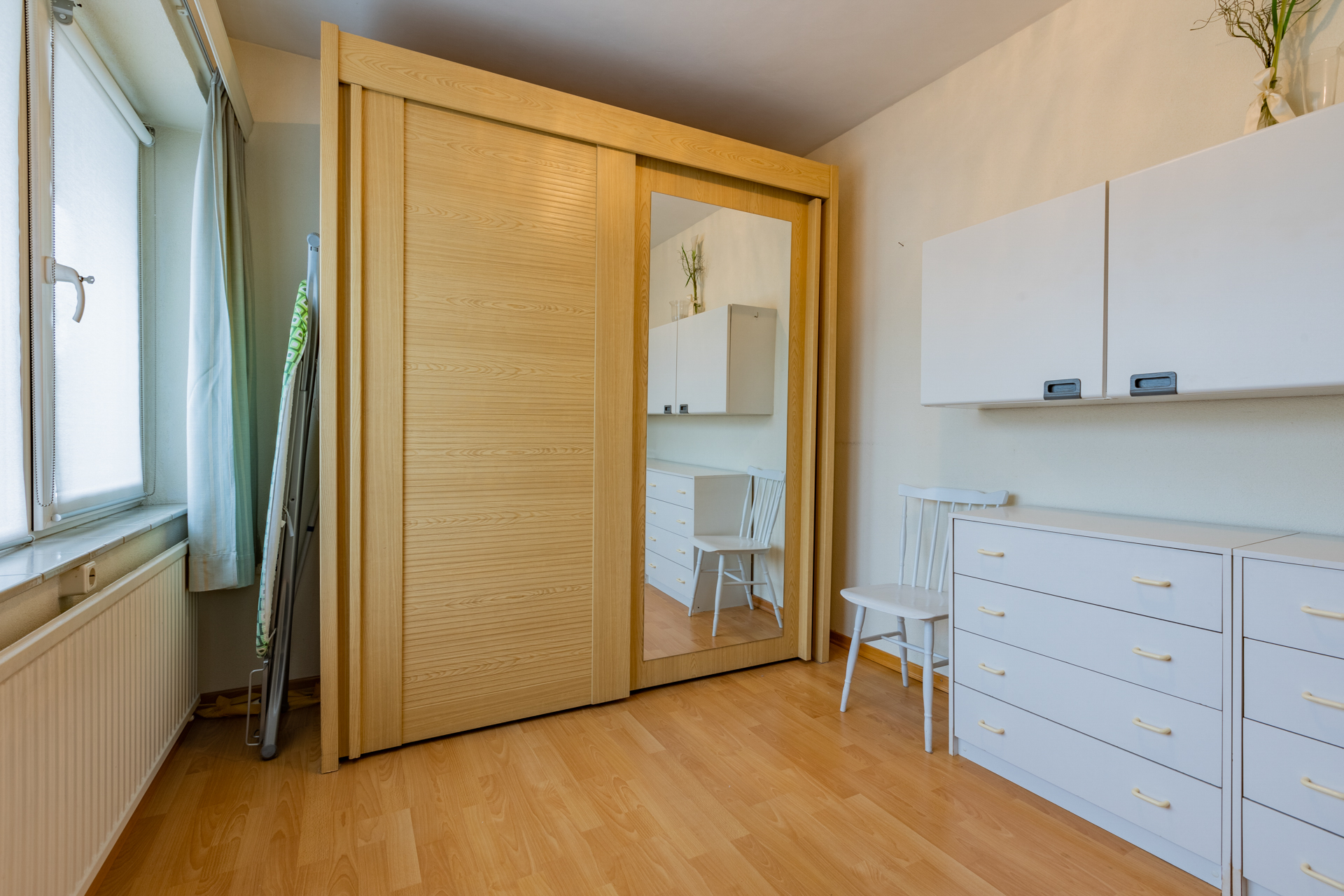 Slaapkamer 2 aan voorzijde met een wastafel en afgewerkt met een laminaatvloer, stucwerk wanden en een pleisterwerk plafond.