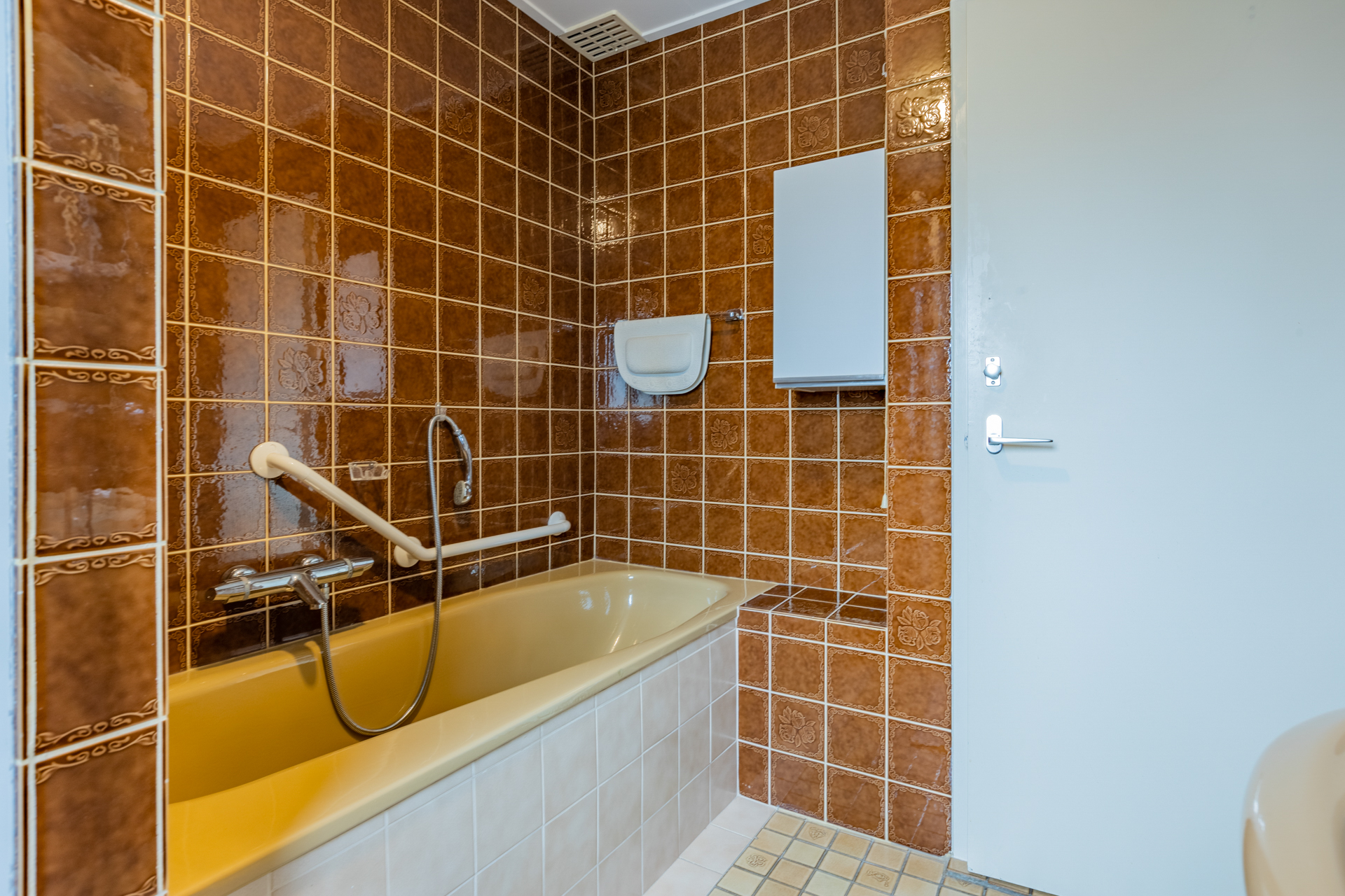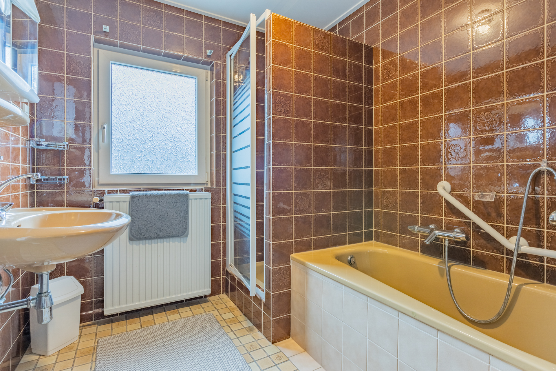 Betegelde goed onderhouden badkamer voorzien van een ligbad, separate douche cabine met thermostaatkraan en een wastafel.