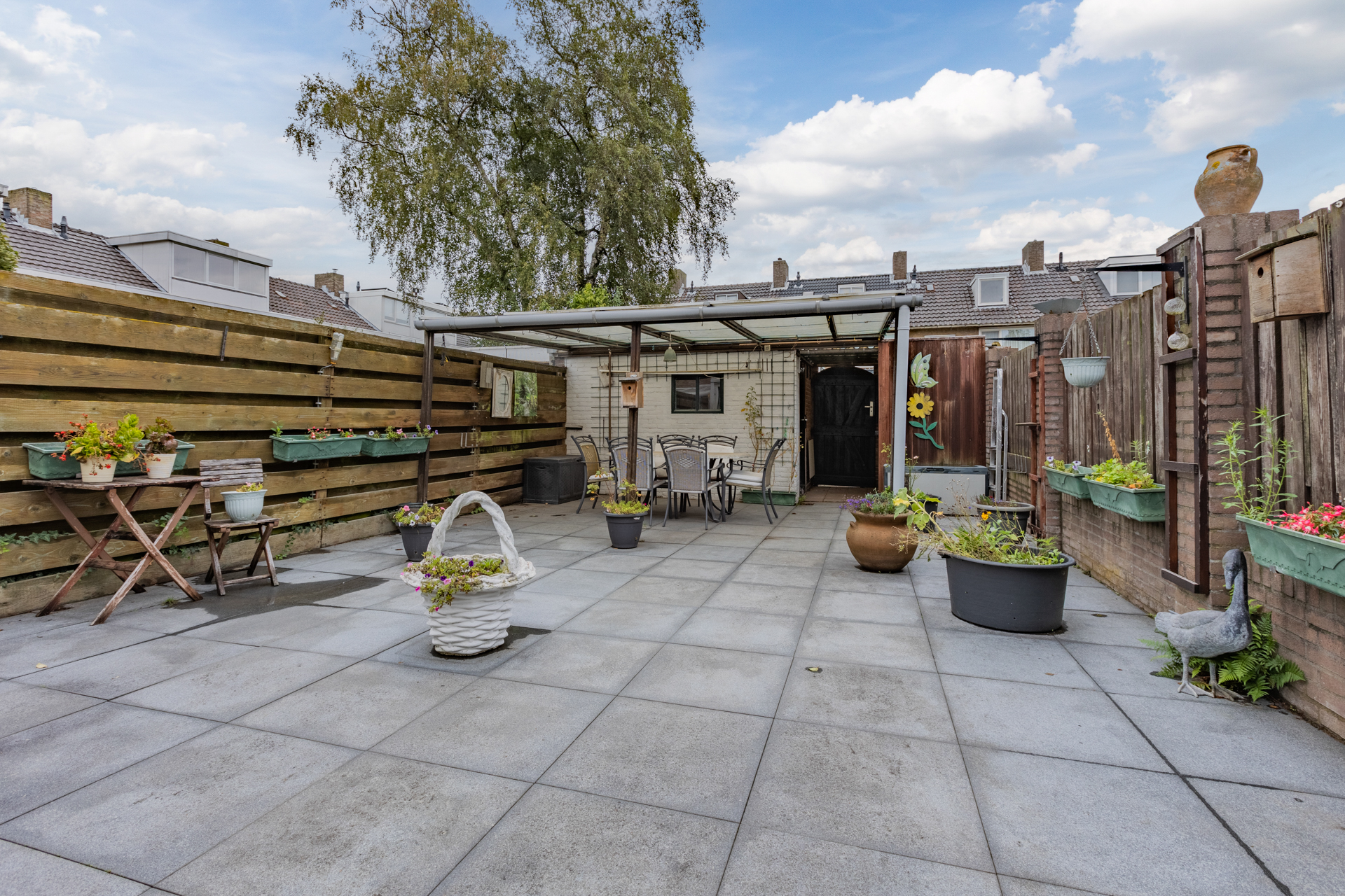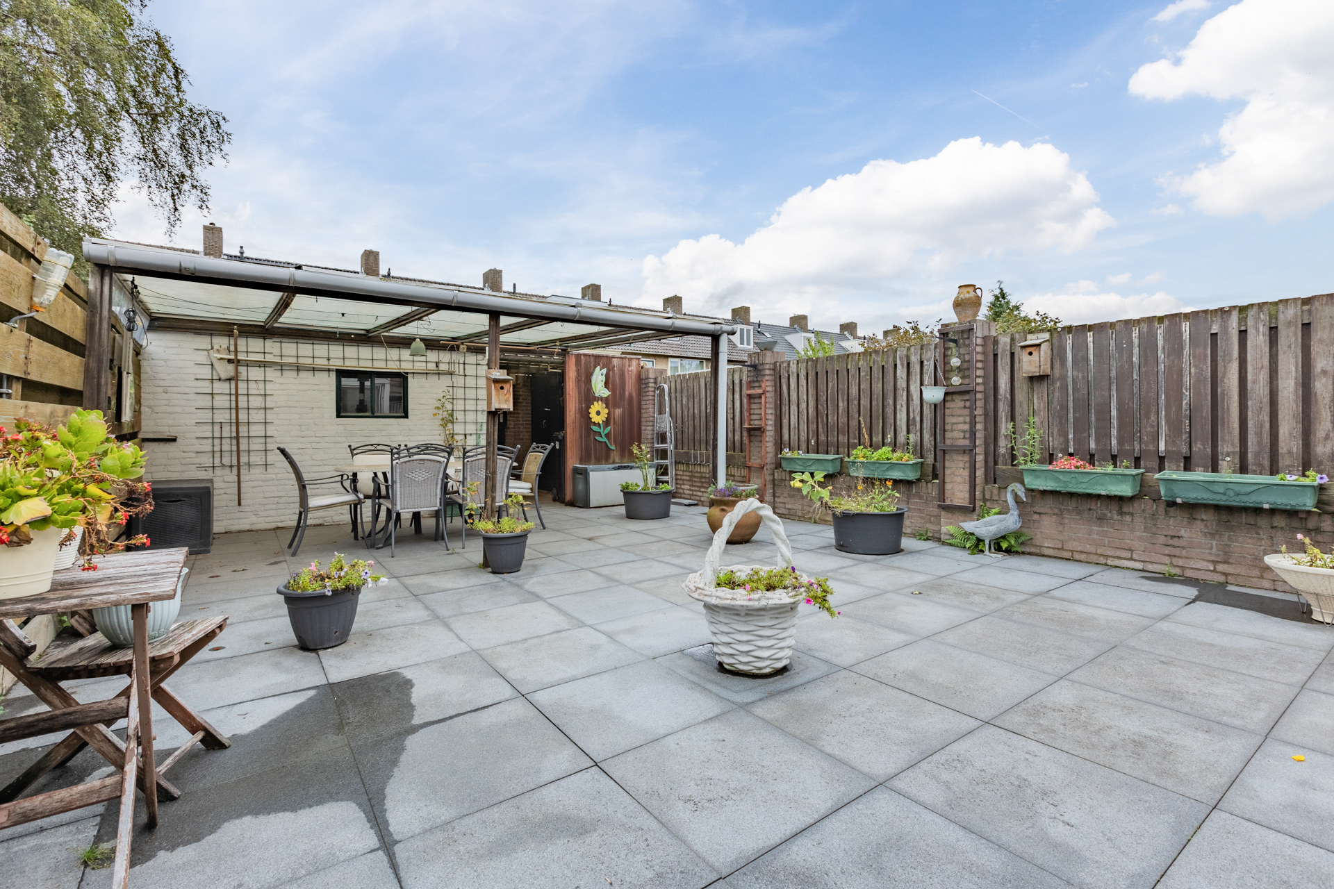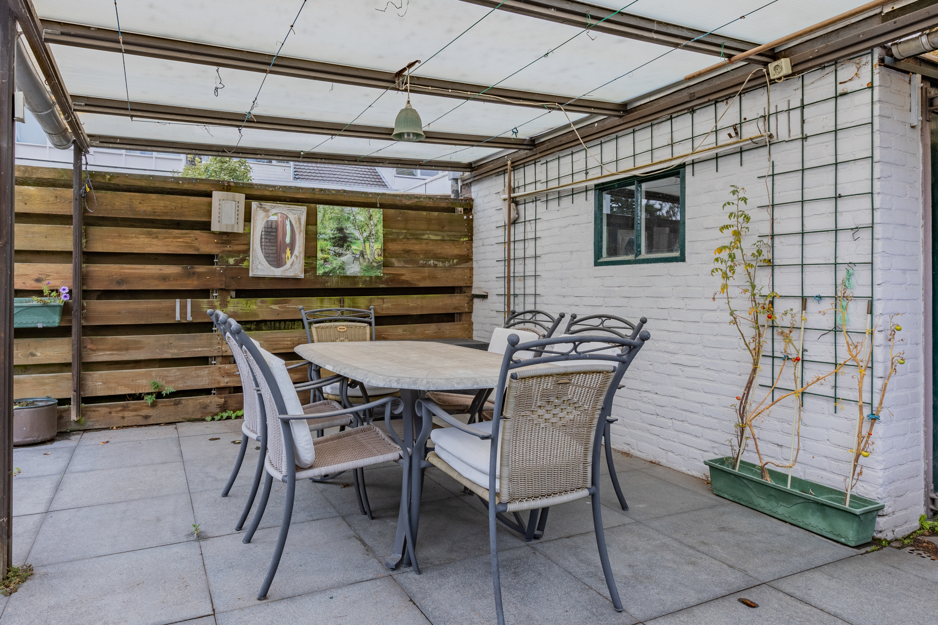 Achtertuin (8.60 x 5.95 meter) met een afsluitbare achterom, gemetselde deels houten erfafscheiding, buitenkraantje, terrasoverkapping en aangelegd met mooie terrastegels.