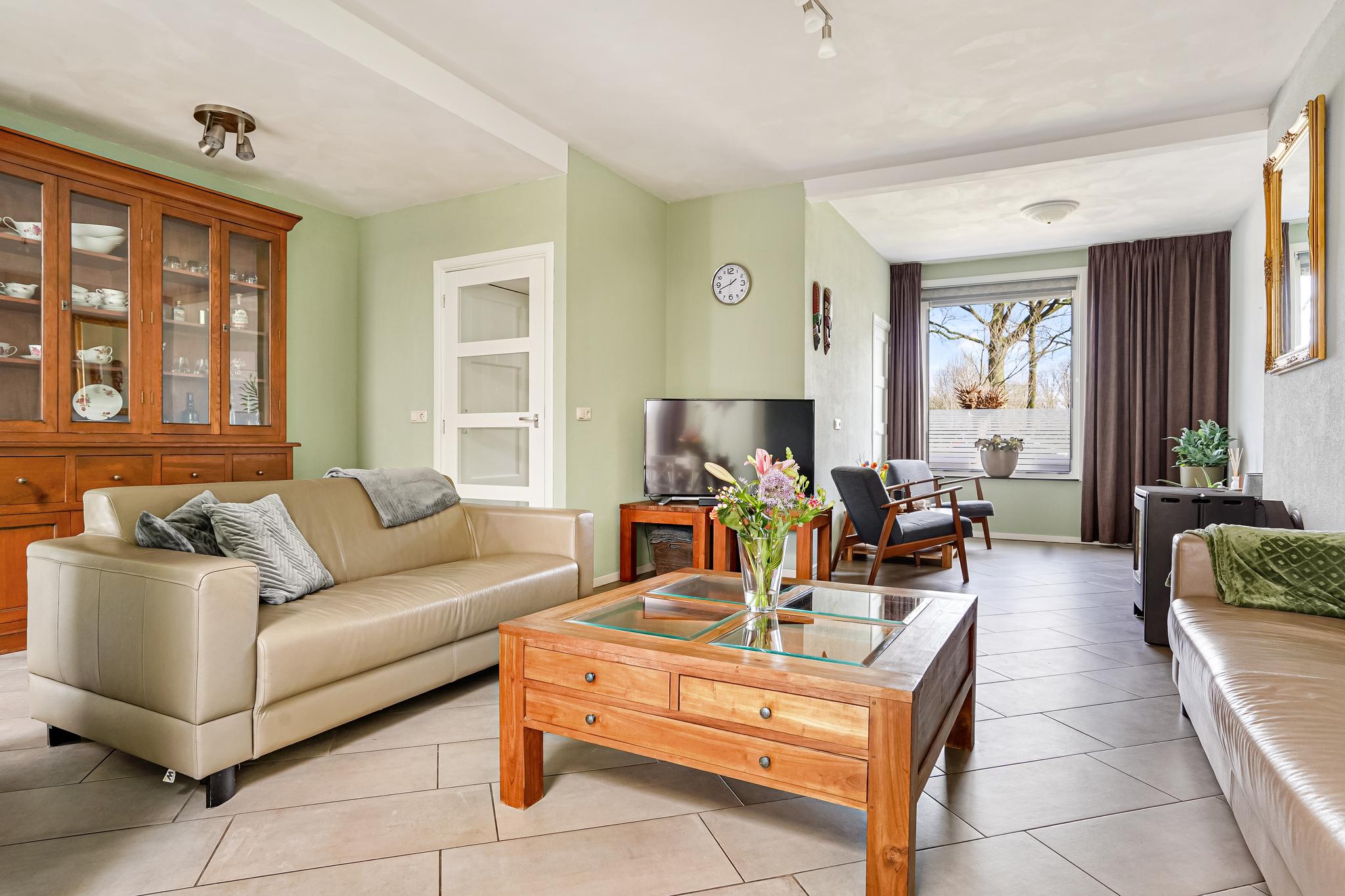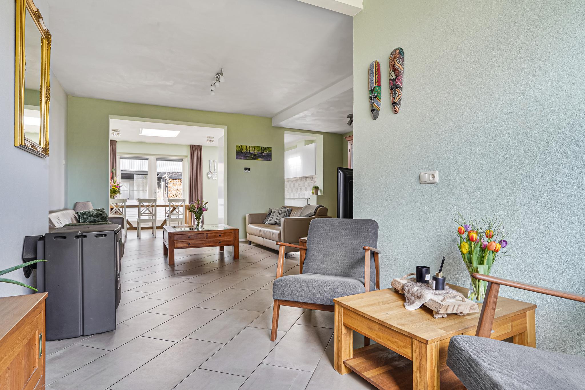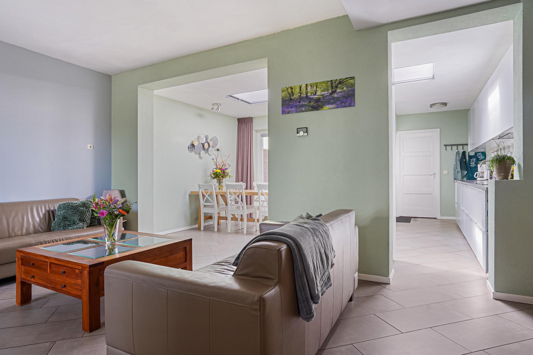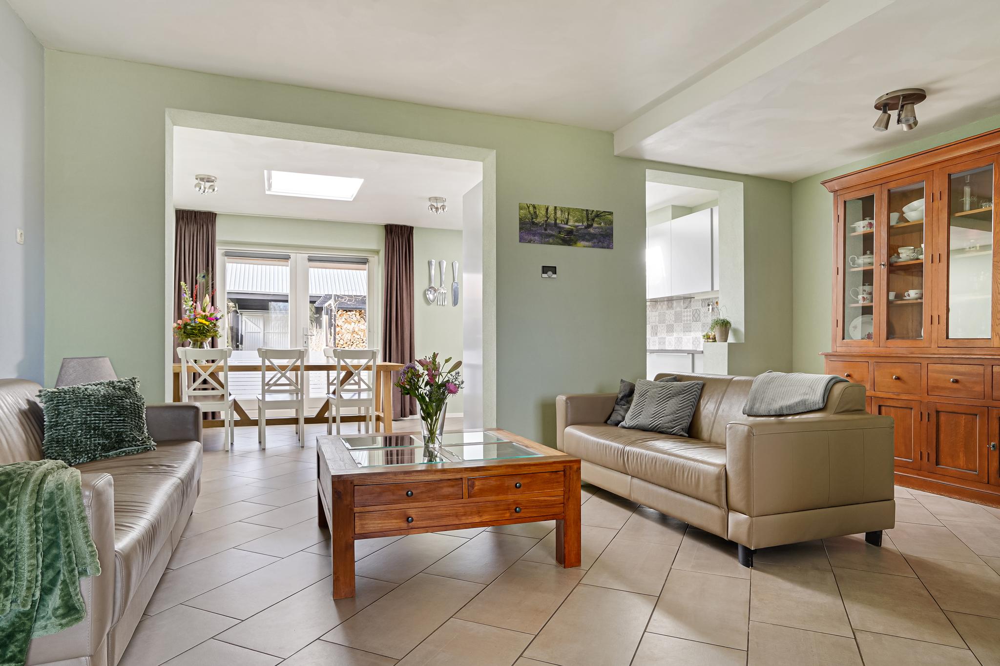 De uitgebouwde living is afgewerkt met een tegelvloer voorzien van vloerverwarming, stucwerk wanden en een fijn schuurwerk plafond.
