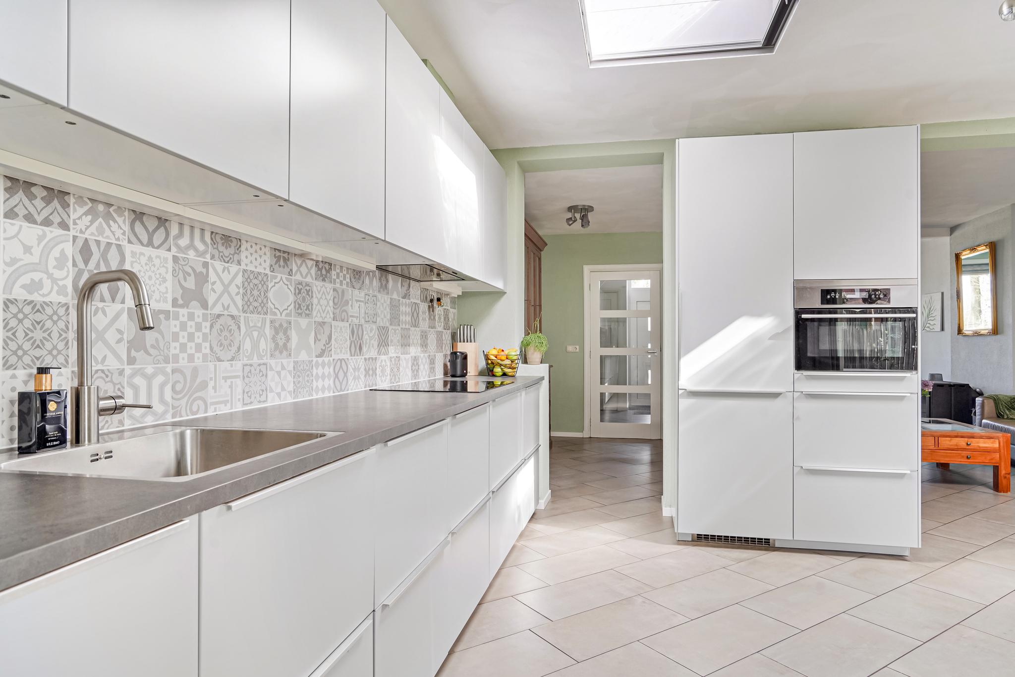 De eigentijdse keukeninrichting is voorzien van diverse laden en kasten, rvs spoelbak, vaatwasmachine, inductie kookplaat, afzuigkap, koelkast, vrieskast en een combi oven/magnetron.