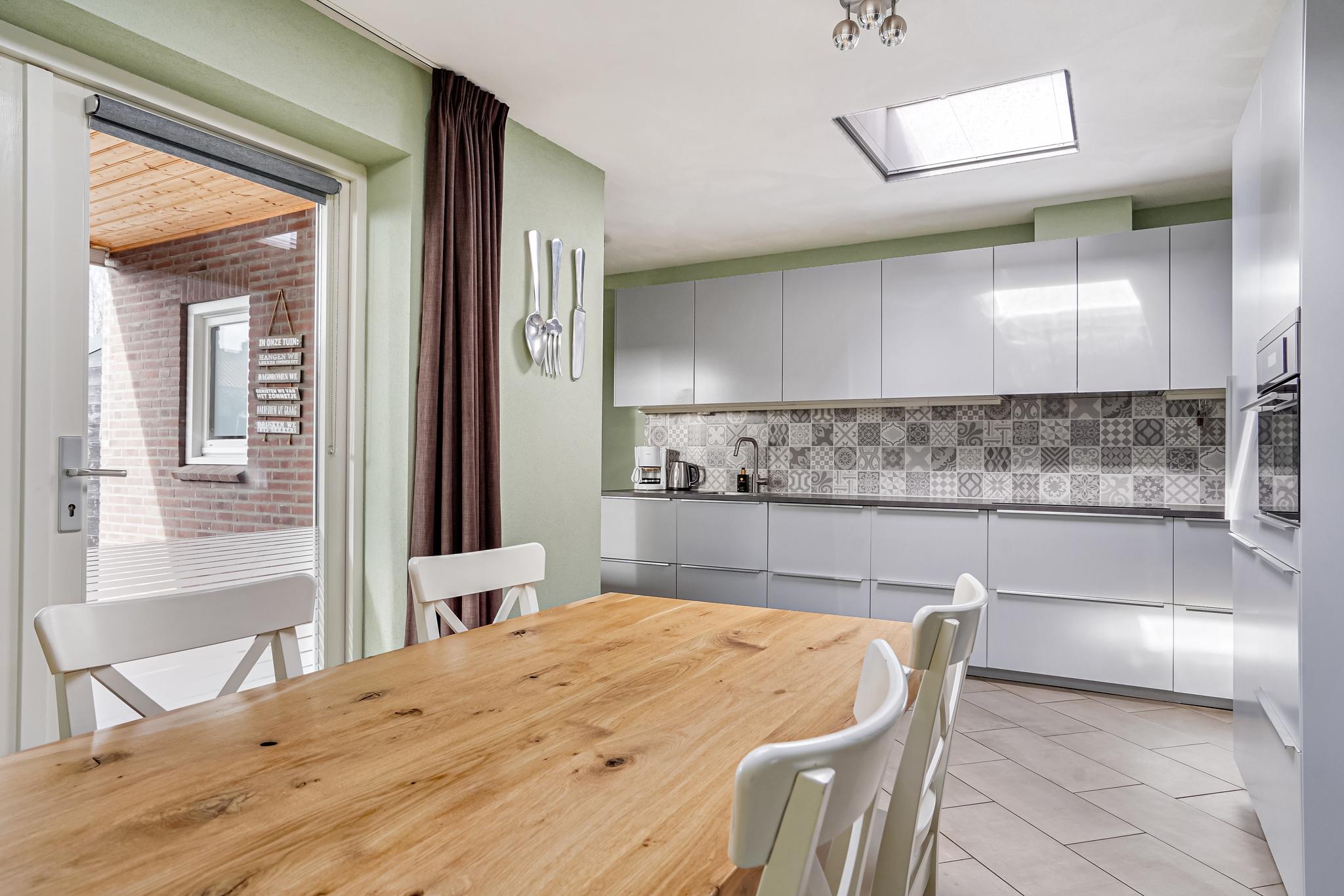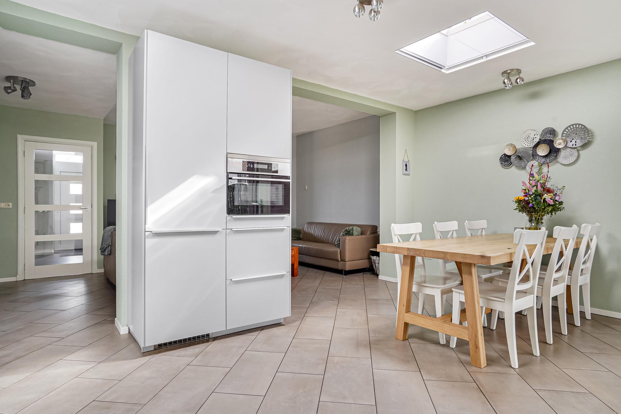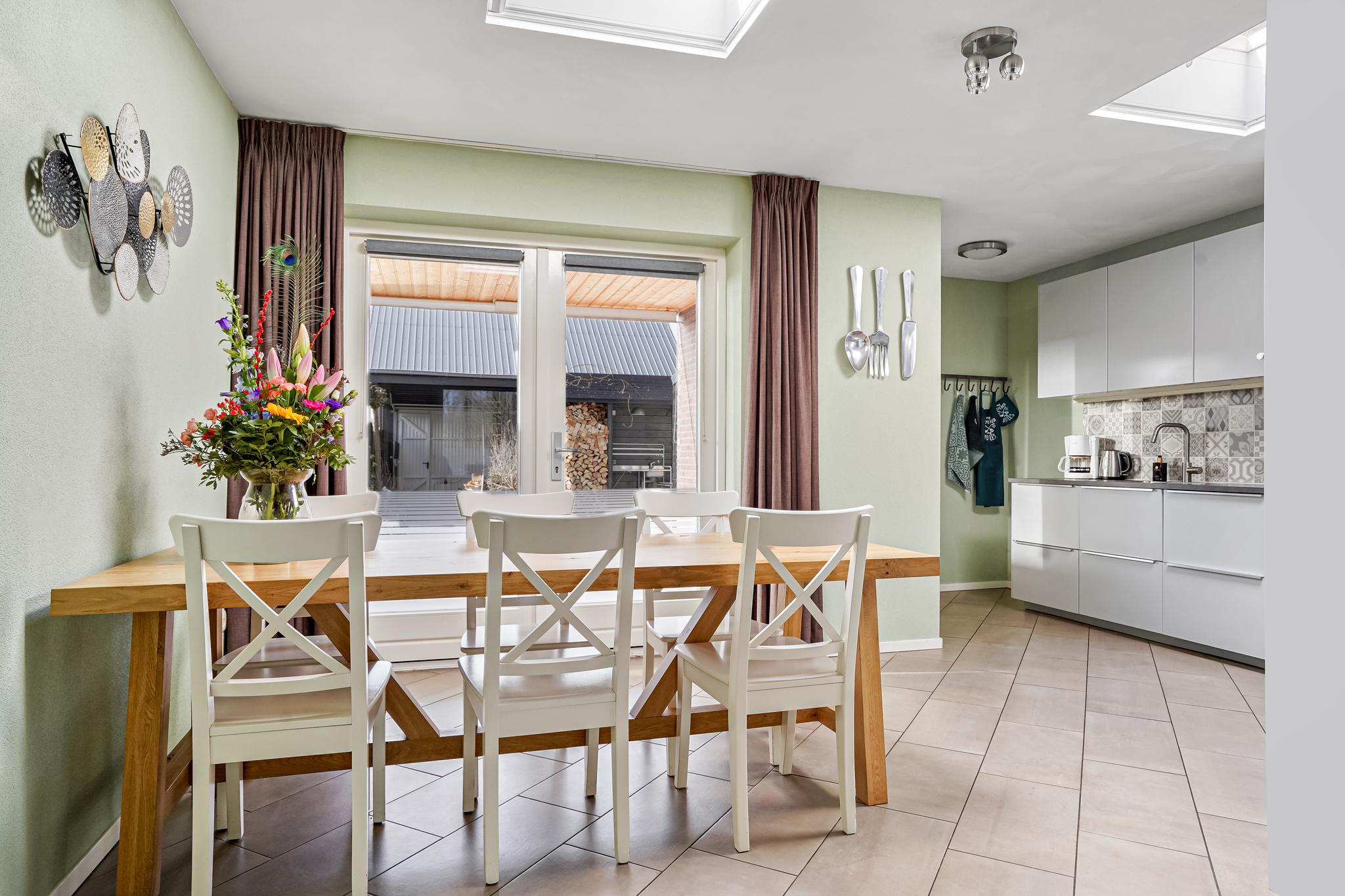 Open eetkeuken met openslaande tuindeuren en afgewerkt met een tegelvloer voorzien van vloerverwarming.