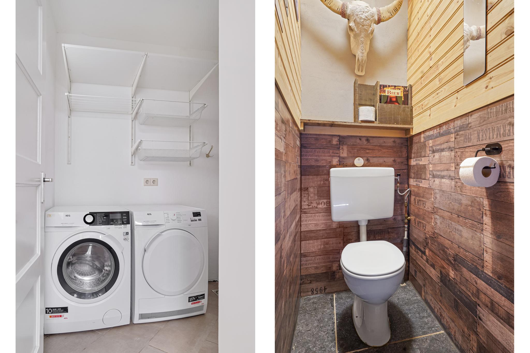 Bijkeuken met aansluiting t.b.v. wasapparatuur en een vaste kast met de opstelling van de HR c.v. combiketel van Remeha (2018) en de regelunit van de vloerverwarming.