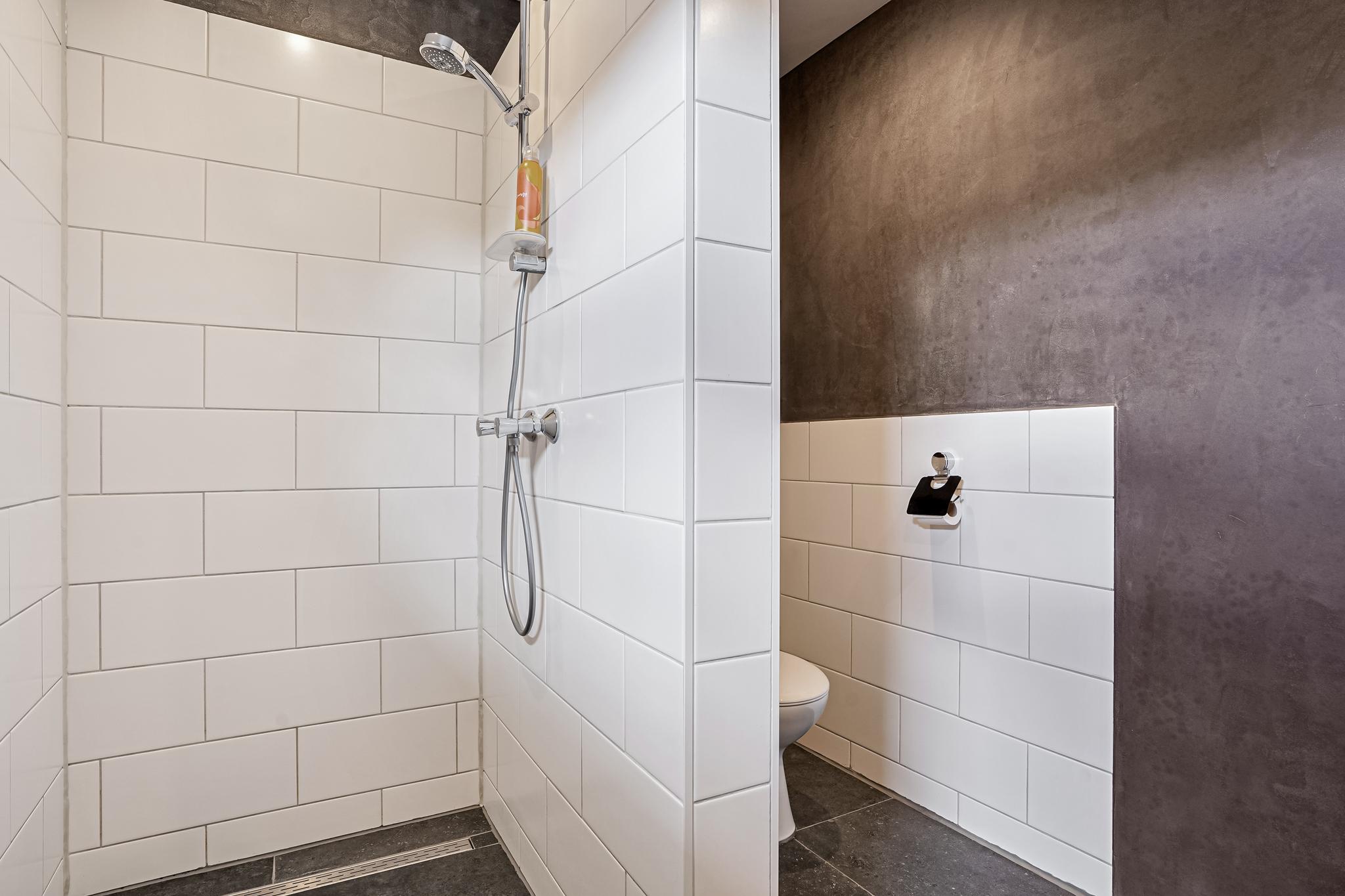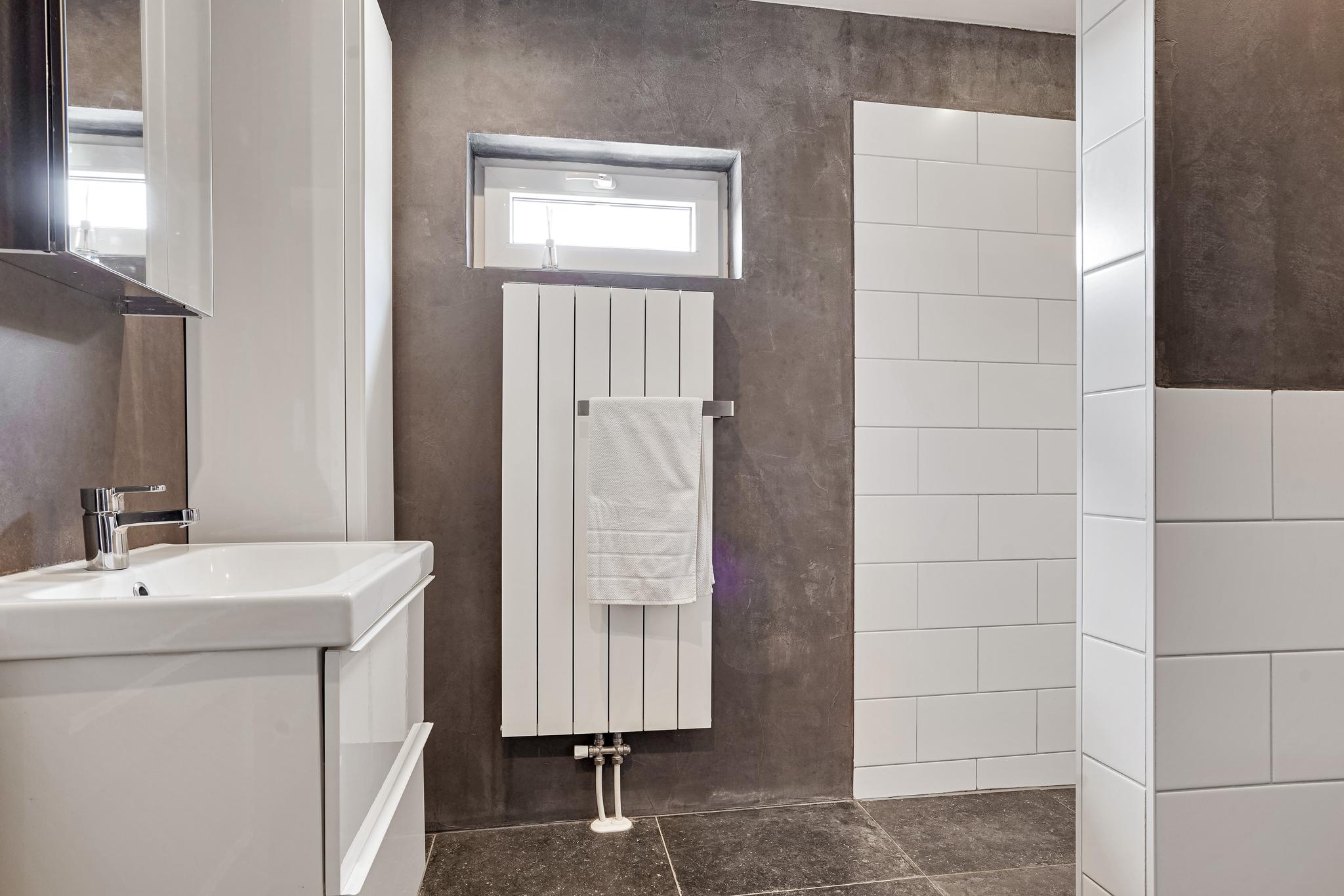 De gemoderniseerde betegelde badkamer is voorzien van een ruime inloopdouche, badmeubel met wastafel en een closet.