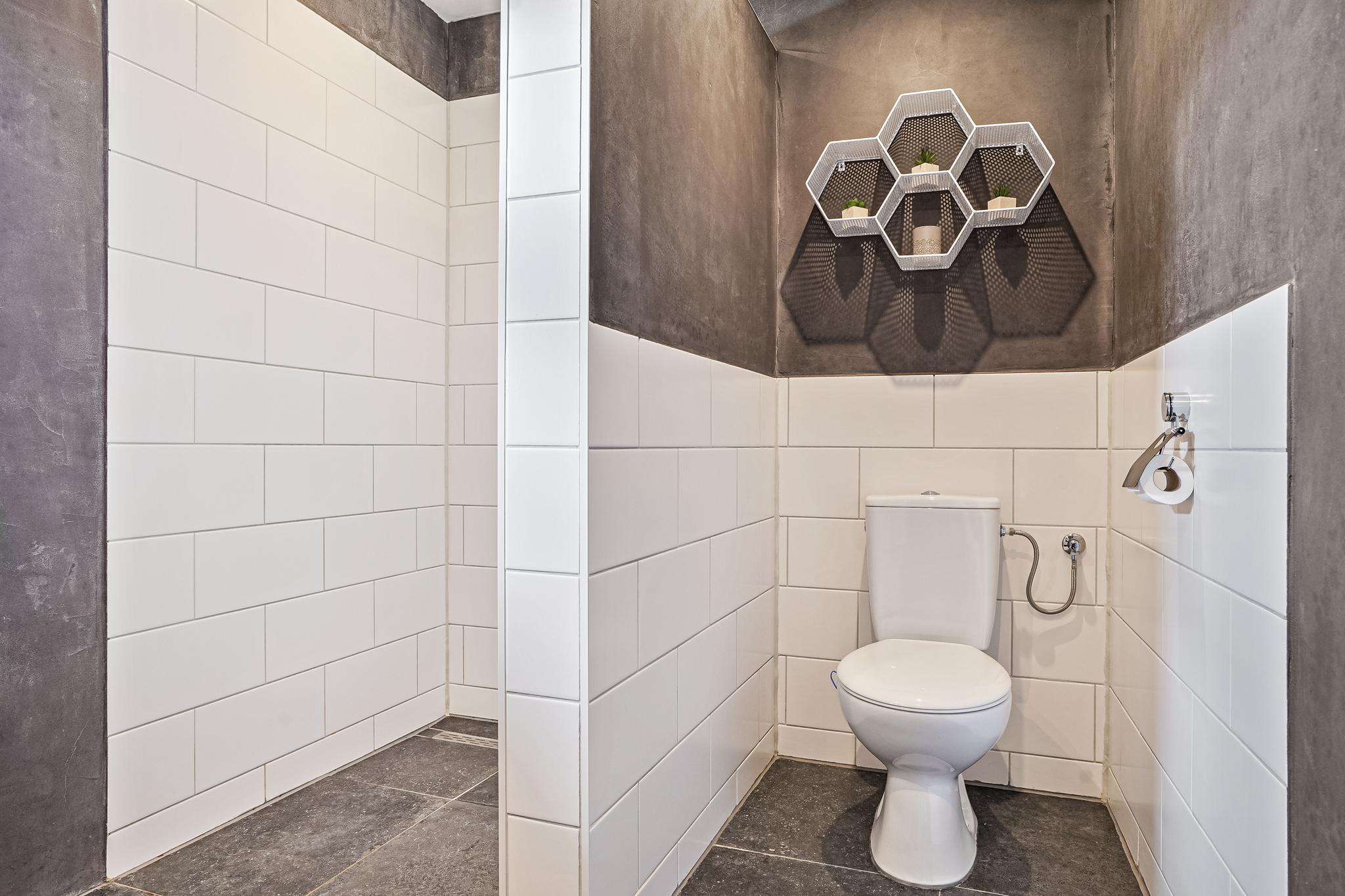 Deels betegelde toiletruimte met een closet en buitenraampje.