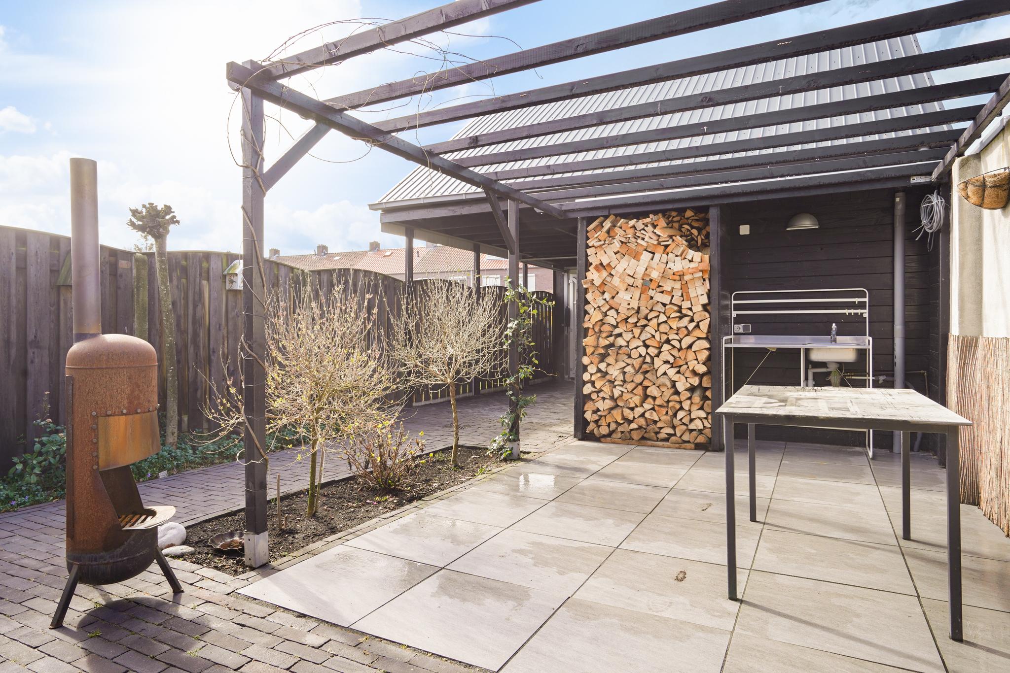 De 12 meter diepe achtertuin met een gezellige pergola, terras, buitenkeuken (warm- en koud water) en aangelegd met sierbestrating, beplanting en terrastegels.