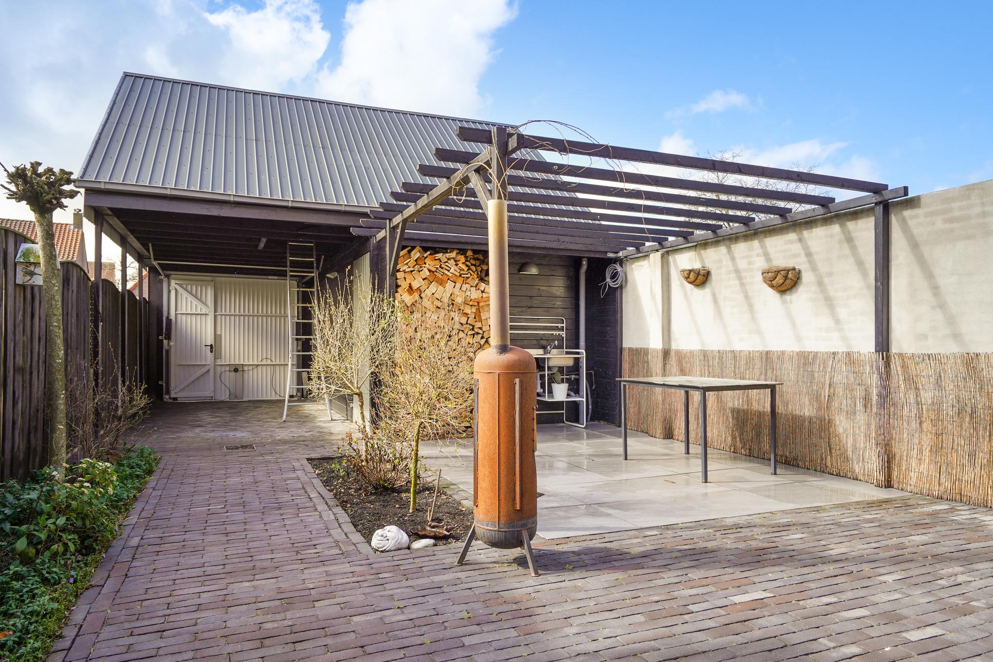 Carport (5.85 x 2.90 meter) met een stalen kanteldeur en geïntegreerde loopdeur.