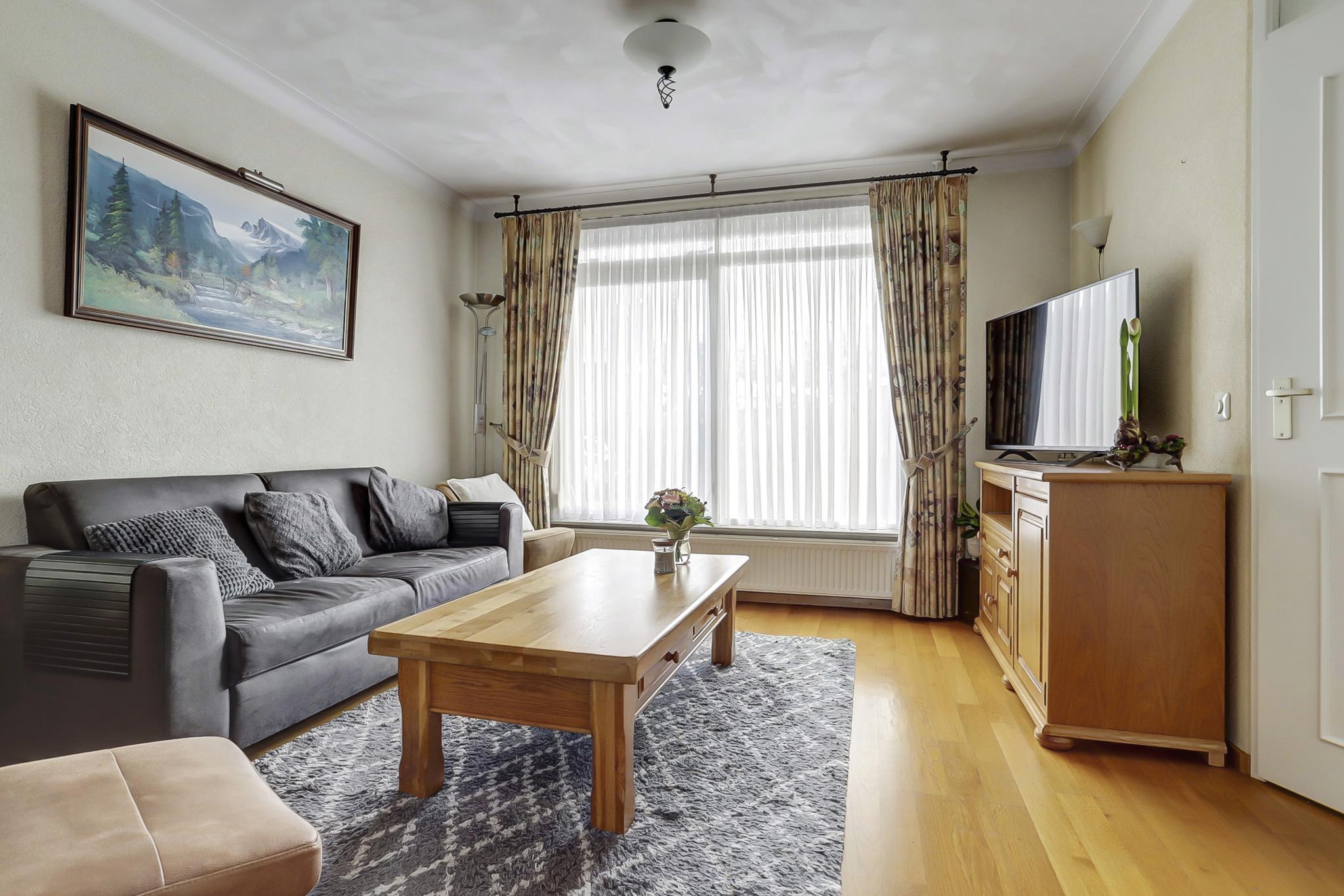 De sfeervolle living is afgewerkt met een massief houten parketvloer, stucwerk (sierpleister) wanden en een fijn schuurwerk plafond.