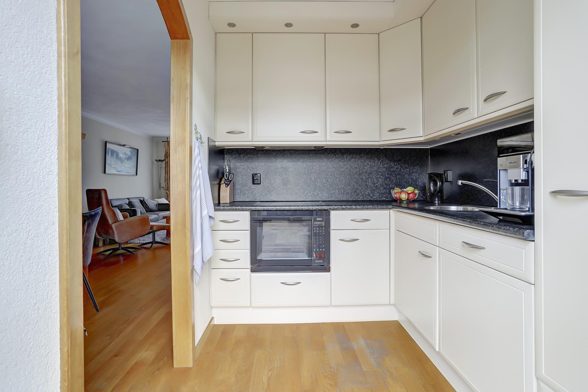Semi open keukenruimte met een nette keukeninrichting in hoekopstelling voorzien van diverse laden en kasten, kunststof aanrechtblad, rvs spoelbak, koel/vries combinatie, vaatwasmachine, oven/magnetron combinatie, keramische kookplaat en een afzuigkap.