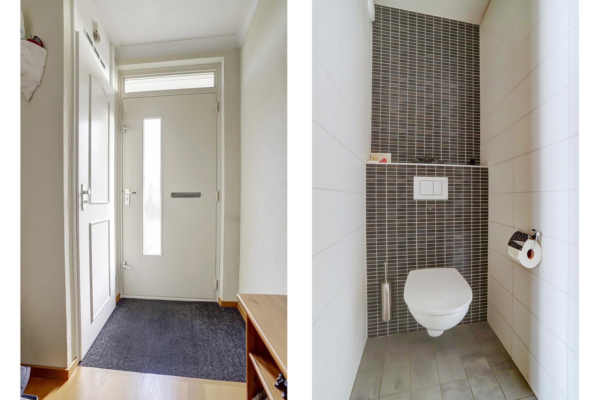 Portaal met de trapopgang en toegang naar de betegelde toiletruimte met een fonteintje en een zwevend closet met muurspoeling.