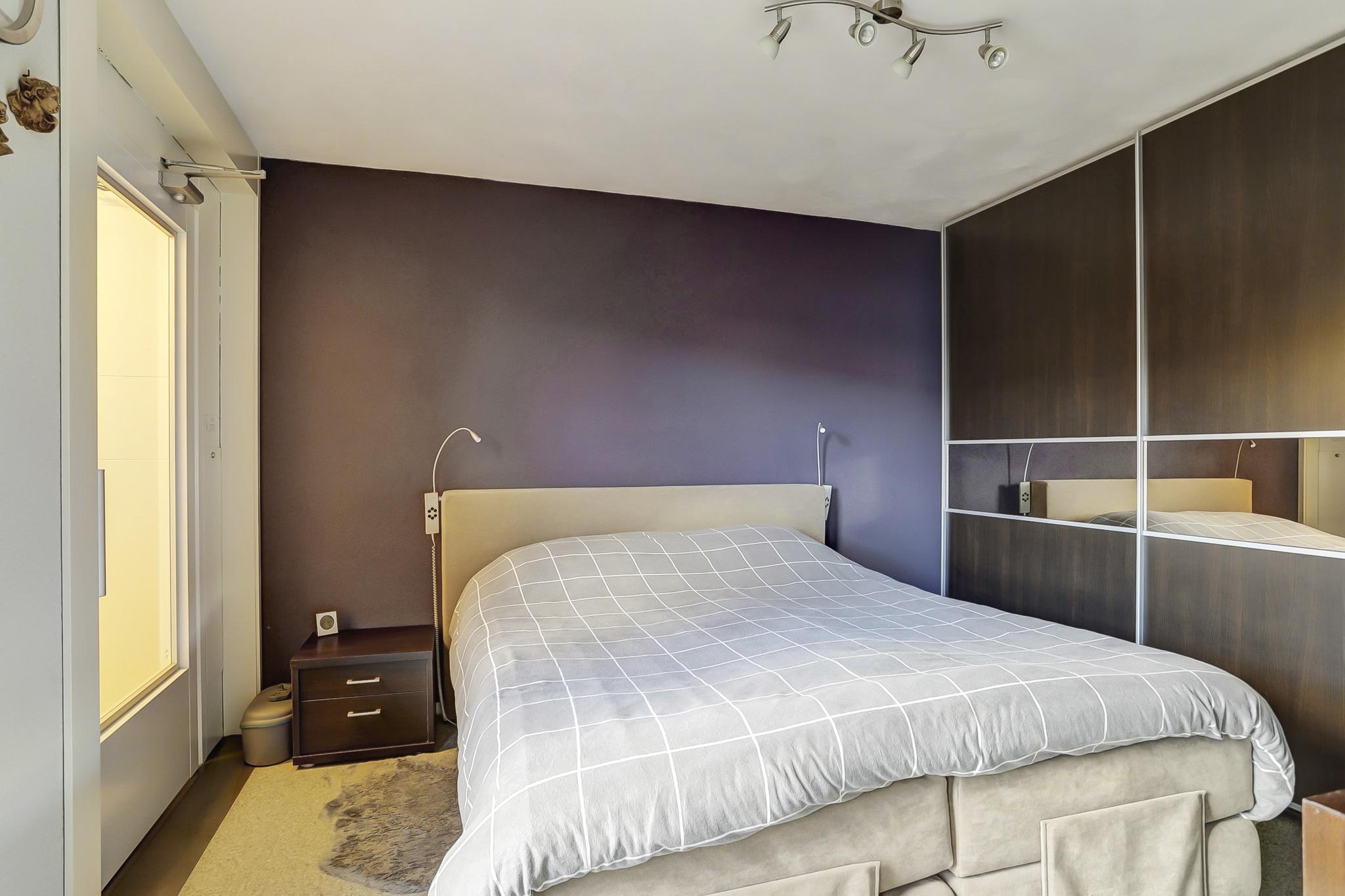 Slaapkamer 1 aan voorzijde is afgewerkt met een vinyl vloer, gesausde wanden en een spuitwerk plafond.