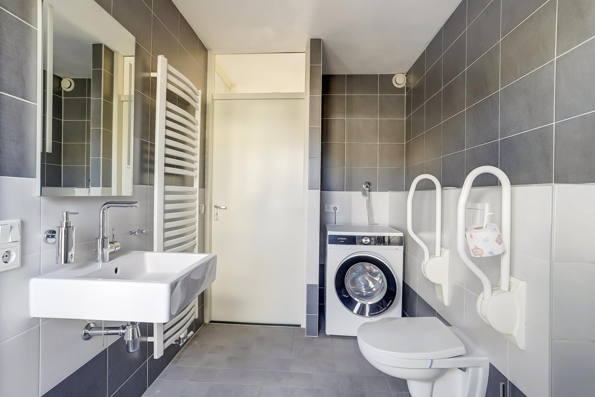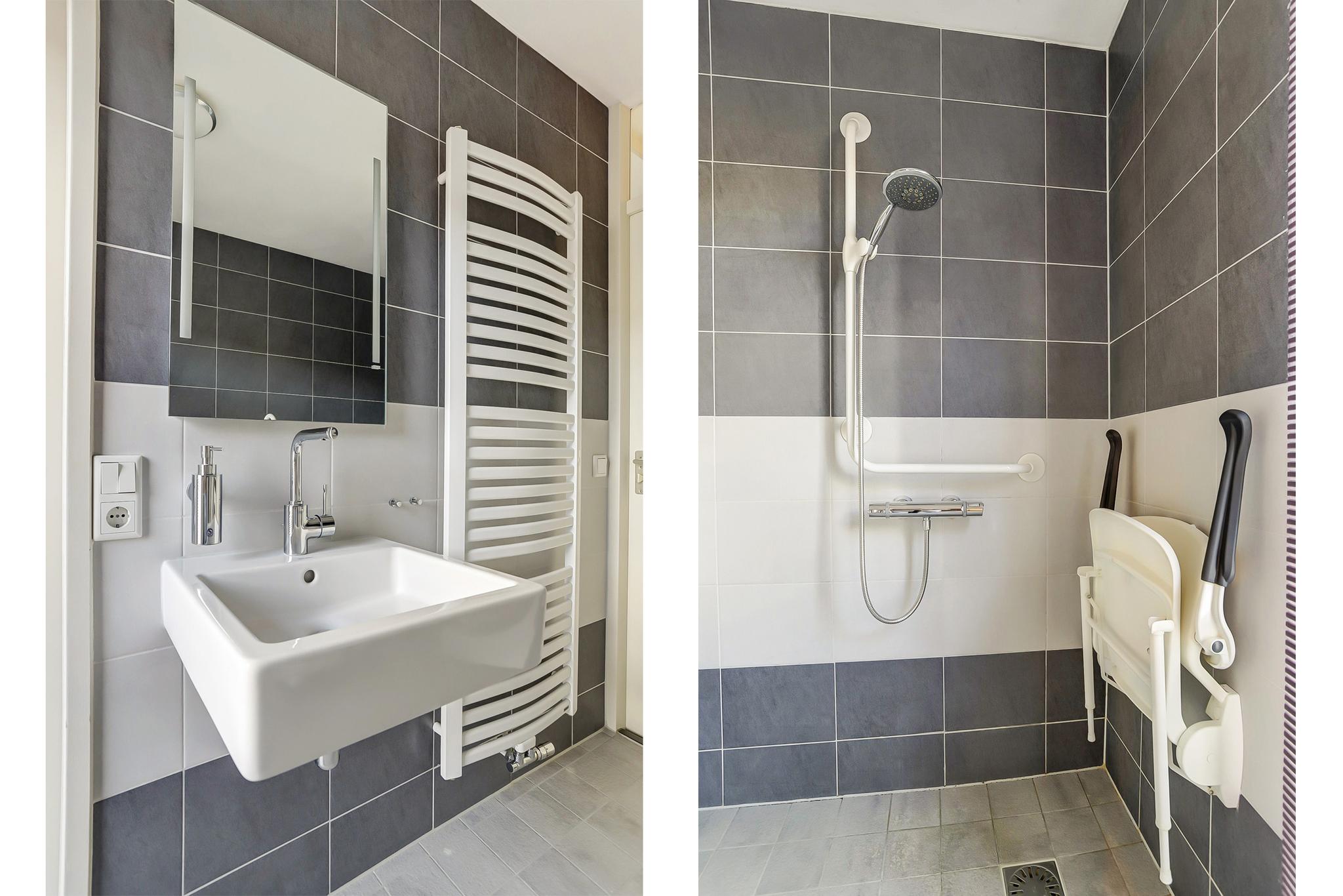Deze ruimte is ingericht met een open douche met thermostaatkraan, vaste wastafel, zwevend closet en een aansluiting t.b.v. wasapparatuur.