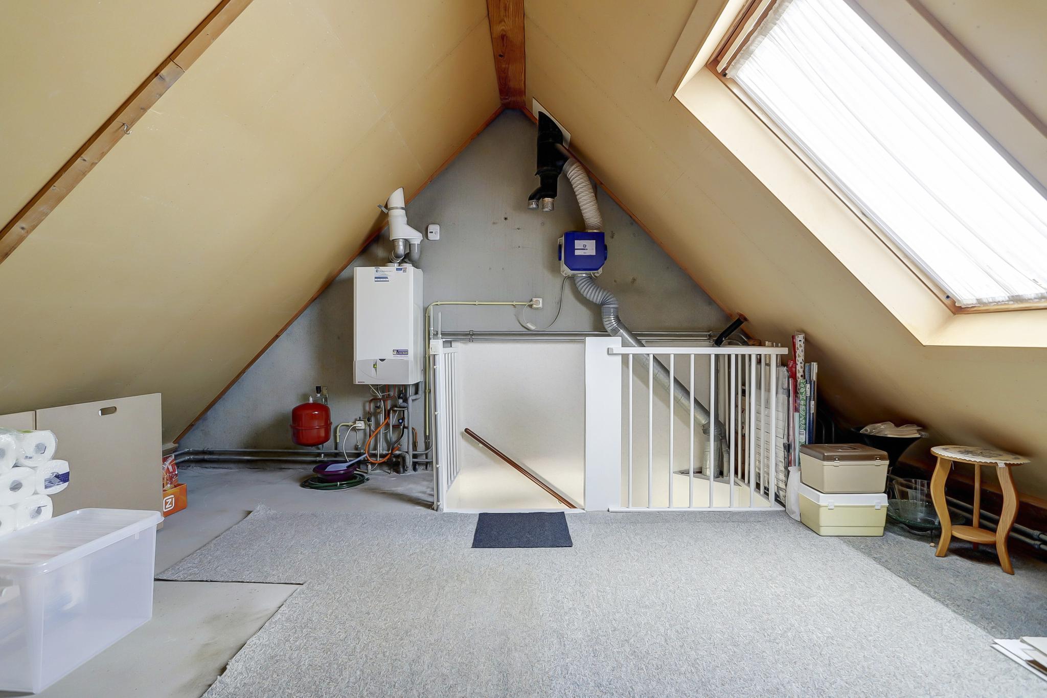 Op deze kamer zijn 2 grote Velux dakvensters geplaatst en de Bosch HR combiketel uit (2008) en tevens de vernieuwde unit t.b.v. de mechanische ventilatie.