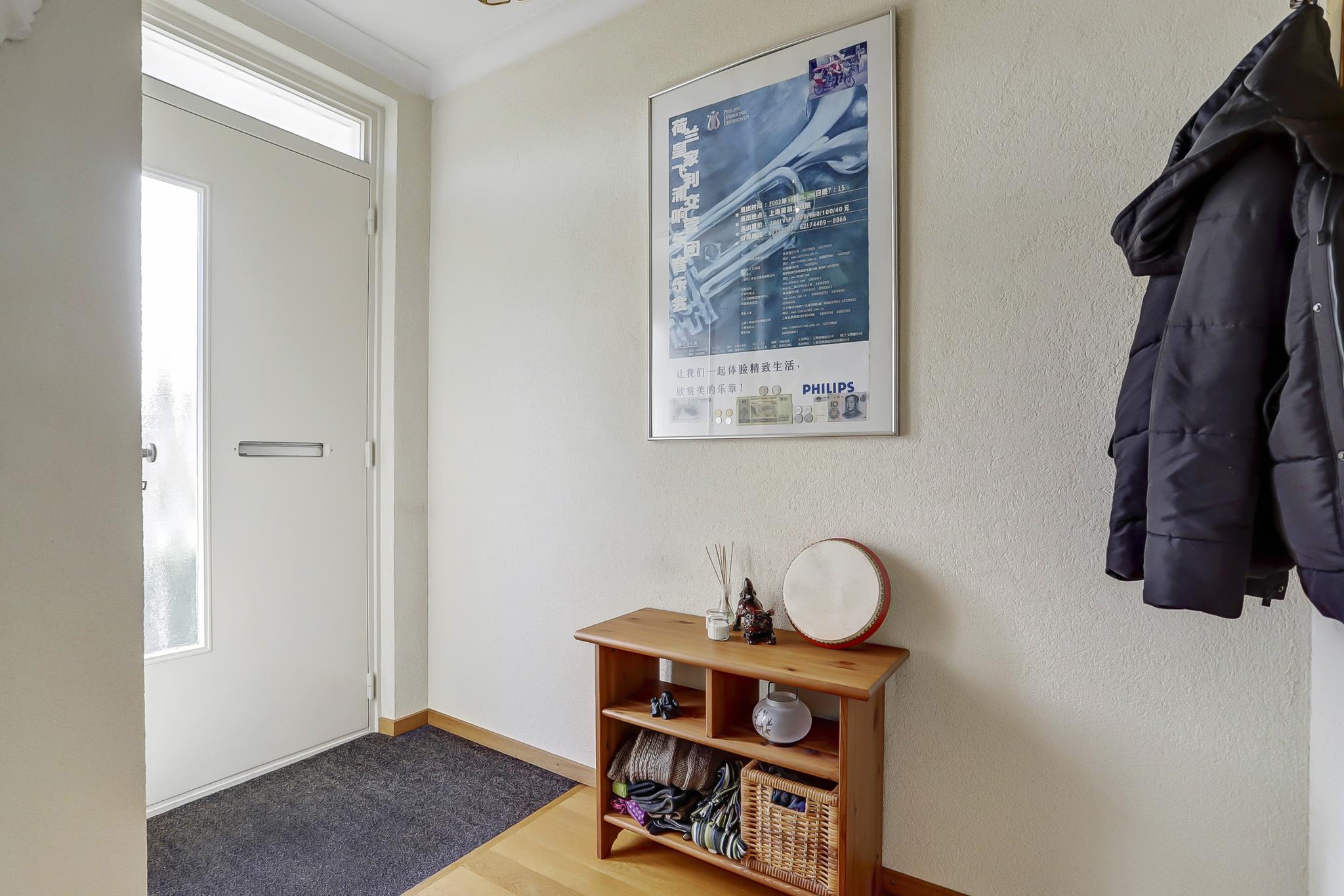 Hal is afgewerkt met een parketvloer, stucwerk (sierpleister) wanden en een fijn schuurwerk plafond.