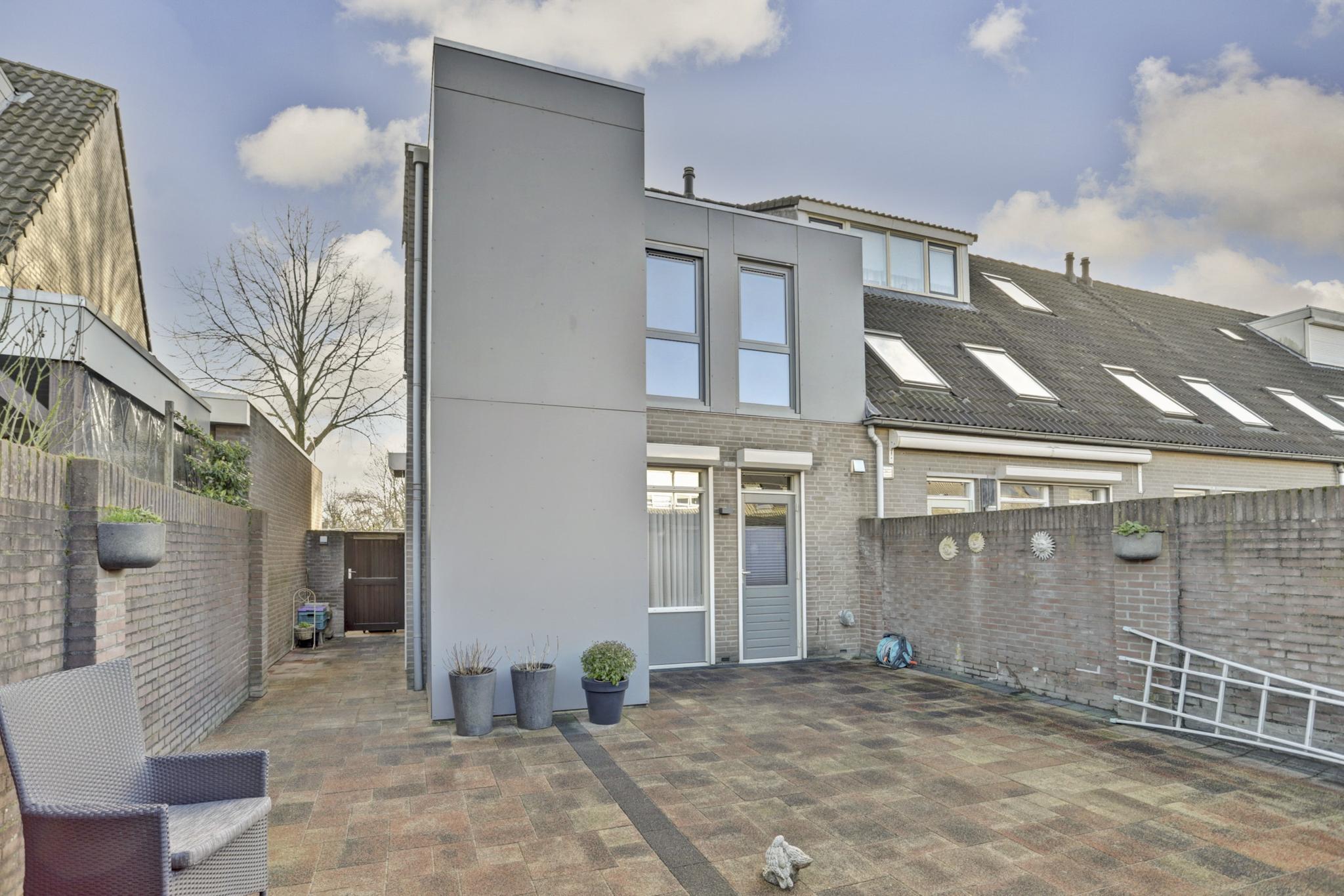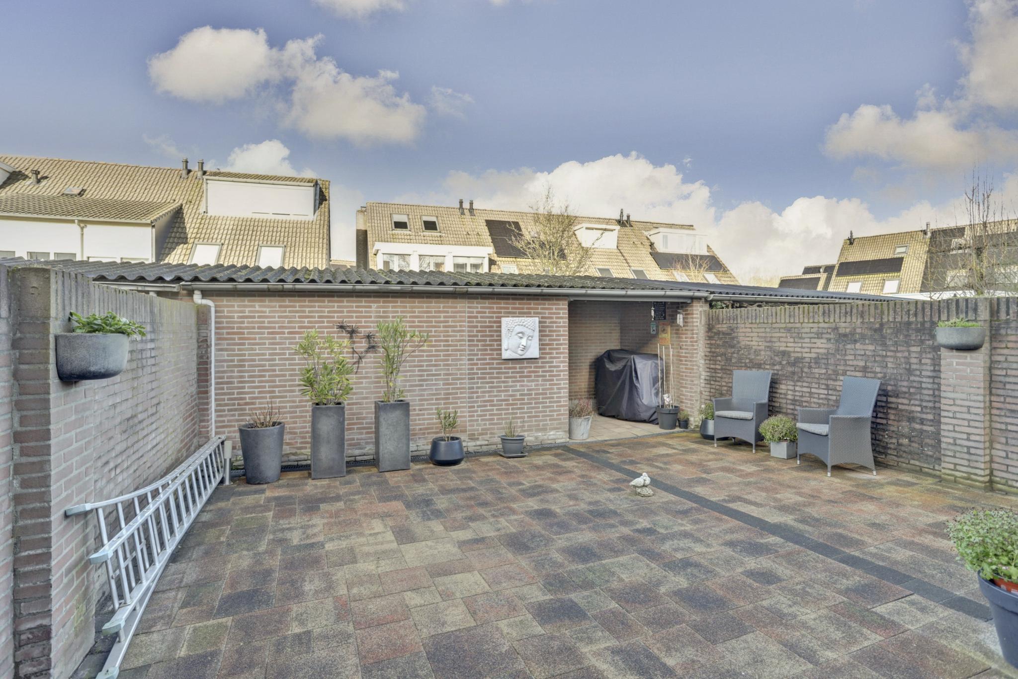 De achtertuin (7.20 x 7.00 meter) met een afsluitbare achterom, gemetselde erfafscheiding, buitenkraantje, drain en aangelegd met nette sierbestrating.